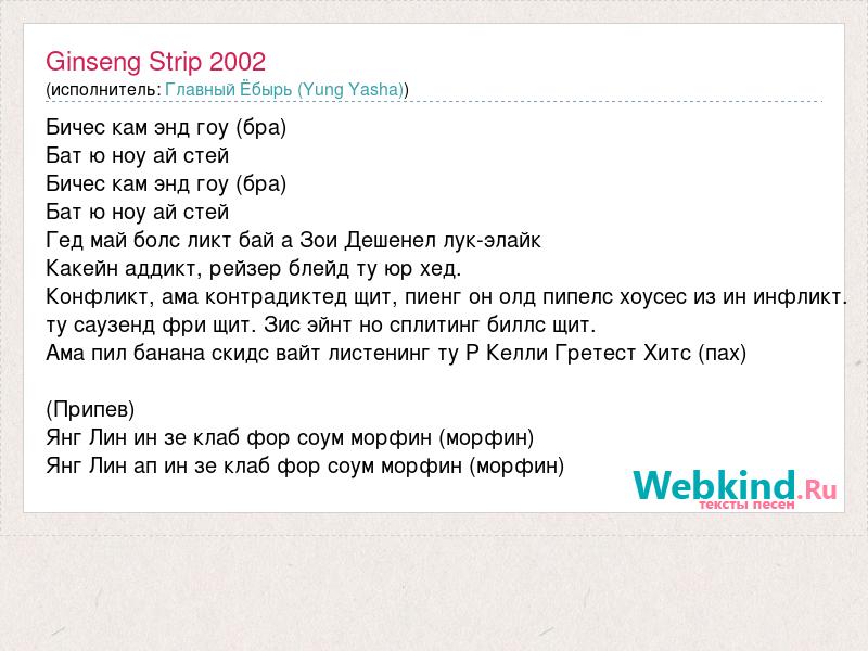 Бичес кам энд гоу (бра) Бат ю ноу ай стей Бичес кам энд гоу (бра) Бат ю ноу ай стей Гед май болс ликт бай а Зои Дешенел лук-элайк Какейн аддикт, рейзер блейд ту юр хед. Конфликт, ама контрадиктед щит, пиенг он олд пипелс хоусес из ин инфликт. ту саузенд фри щит. Зис эйнт но сплитинг биллс щит. Ама пил банана скидс вайт листенинг ту Р Келли Гретест Хитс (пах) (Припев) Янг Лин ин зе клаб фор соум морфин (морфин) Янг Лин ап ин зе клаб фор соум морфин (морфин)
