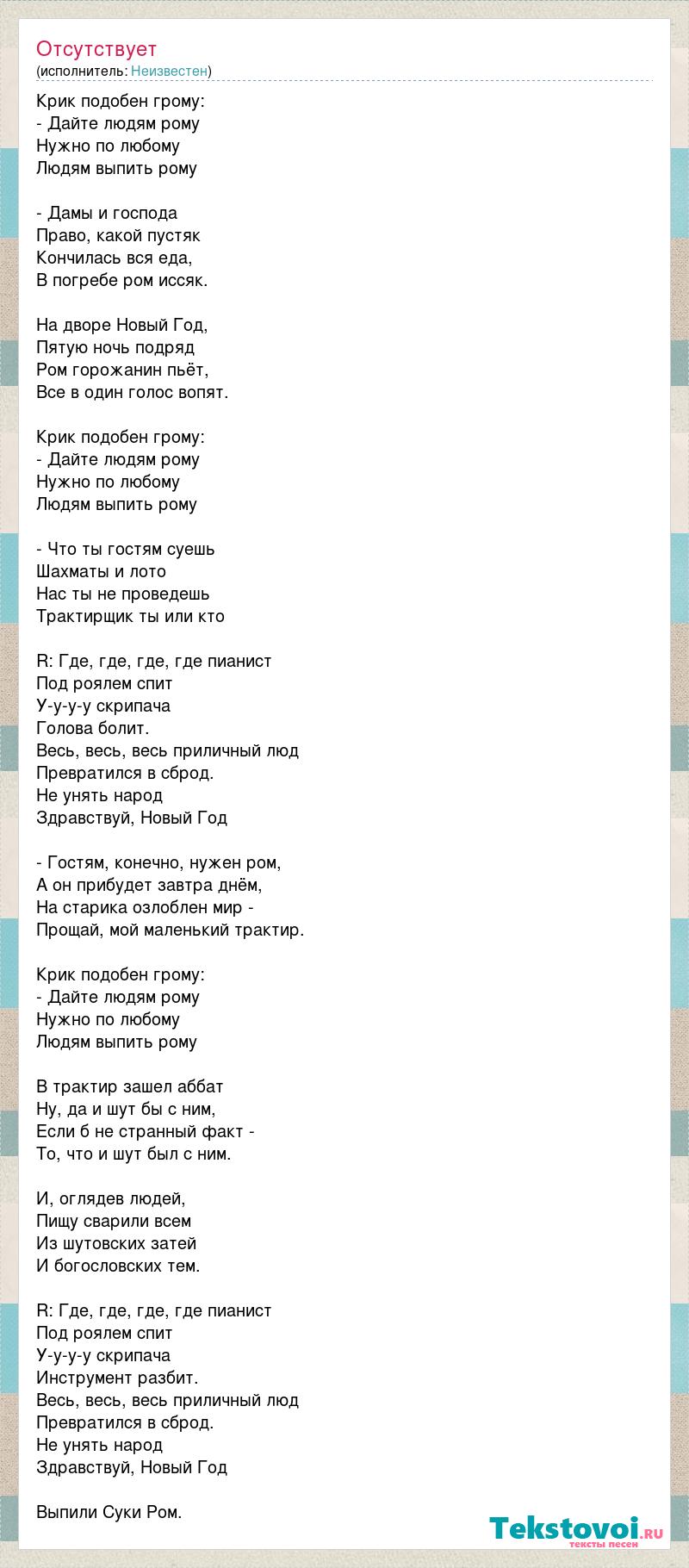 Крик подобен грому: - Дайте людям рому Нужно по любому Людям выпить рому - Дамы и господа Право, какой пустяк Кончилась вся еда, В погребе ром иссяк. На дворе Новый Год, Пятую ночь подряд Ром горожанин пьёт, Все в один голос вопят. Крик подобен грому: - Дайте людям рому Нужно по любому Людям выпить рому - Что ты гостям суешь Шахматы и лото Нас ты не проведешь Трактирщик ты или кто R: Где, где, где, где пианист Под роялем спит У-у-у-у скрипача Голова болит. Весь, весь, весь приличный люд Превратился в сброд. Не унять народ Здравствуй, Новый Год - Гостям, конечно, нужен ром, А он прибудет завтра днём, На старика озлоблен мир - Прощай, мой маленький трактир. Крик подобен грому: - Дайте людям рому Нужно по любому Людям выпить рому В трактир зашел аббат Ну, да и шут бы с ним, Если б не странный факт - То, что и шут был с ним. И, оглядев людей, Пищу сварили всем Из шутовских затей И богословских тем. R: Где, где, где, где пианист Под роялем спит У-у-у-у скрипача Инструмент разбит. Весь, весь, весь приличный люд Превратился в сброд. Не унять народ Здравствуй, Новый Год Выпили Суки Ром.