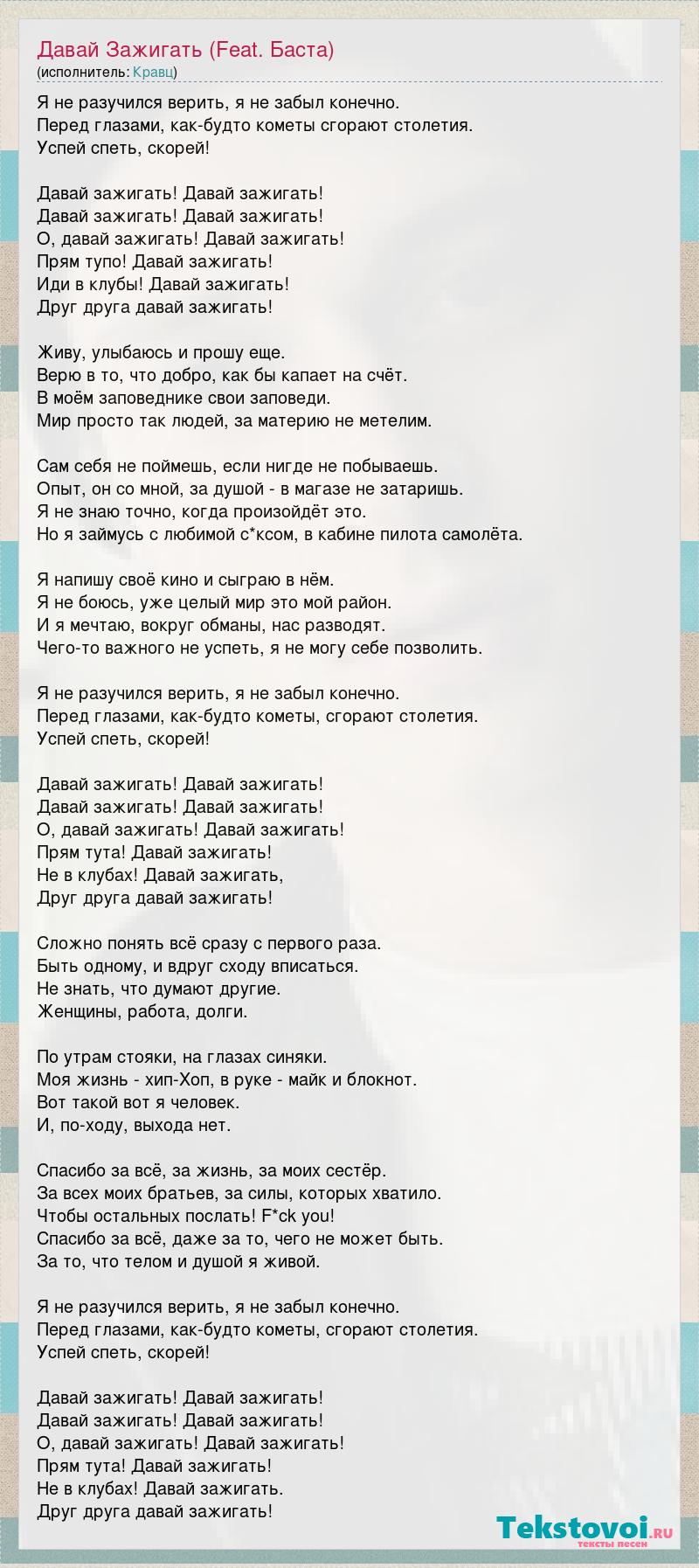 Я не разучился верить, я не забыл конечно. Перед глазами, как-будто кометы сгорают столетия. Успей спеть, скорей! Давай зажигать! Давай зажигать! Давай зажигать! Давай зажигать! О, давай зажигать! Давай зажигать! Прям тупо! Давай зажигать! Иди в клубы! Давай зажигать! Друг друга давай зажигать! Живу, улыбаюсь и прошу еще. Верю в то, что добро, как бы капает на счёт. В моём заповеднике свои заповеди. Мир просто так людей, за материю не метелим. Сам себя не поймешь, если нигде не побываешь. Опыт, он со мной, за душой - в магазе не затаришь. Я не знаю точно, когда произойдёт это. Но я займусь с любимой с*ксом, в кабине пилота самолёта. Я напишу своё кино и сыграю в нём. Я не боюсь, уже целый мир это мой район. И я мечтаю, вокруг обманы, нас разводят. Чего-то важного не успеть, я не могу себе позволить. Я не разучился верить, я не забыл конечно. Перед глазами, как-будто кометы, сгорают столетия. Успей спеть, скорей! Давай зажигать! Давай зажигать! Давай зажигать! Давай зажигать! О, давай зажигать! Давай зажигать! Прям тута! Давай зажигать! Не в клубах! Давай зажигать, Друг друга давай зажигать! Сложно понять всё сразу с первого раза. Быть одному, и вдруг сходу вписаться. Не знать, что думают другие. Женщины, работа, долги. По утрам стояки, на глазах синяки. Моя жизнь - хип-Хоп, в руке - майк и блокнот. Вот такой вот я человек. И, по-ходу, выхода нет. Спасибо за всё, за жизнь, за моих сестёр. За всех моих братьев, за силы, которых хватило. Чтобы остальных послать! F*ck you! Спасибо за всё, даже за то, чего не может быть. За то, что телом и душой я живой. Я не разучился верить, я не забыл конечно. Перед глазами, как-будто кометы, сгорают столетия. Успей спеть, скорей! Давай зажигать! Давай зажигать! Давай зажигать! Давай зажигать! О, давай зажигать! Давай зажигать! Прям тута! Давай зажигать! Не в клубах! Давай зажигать. Друг друга давай зажигать!