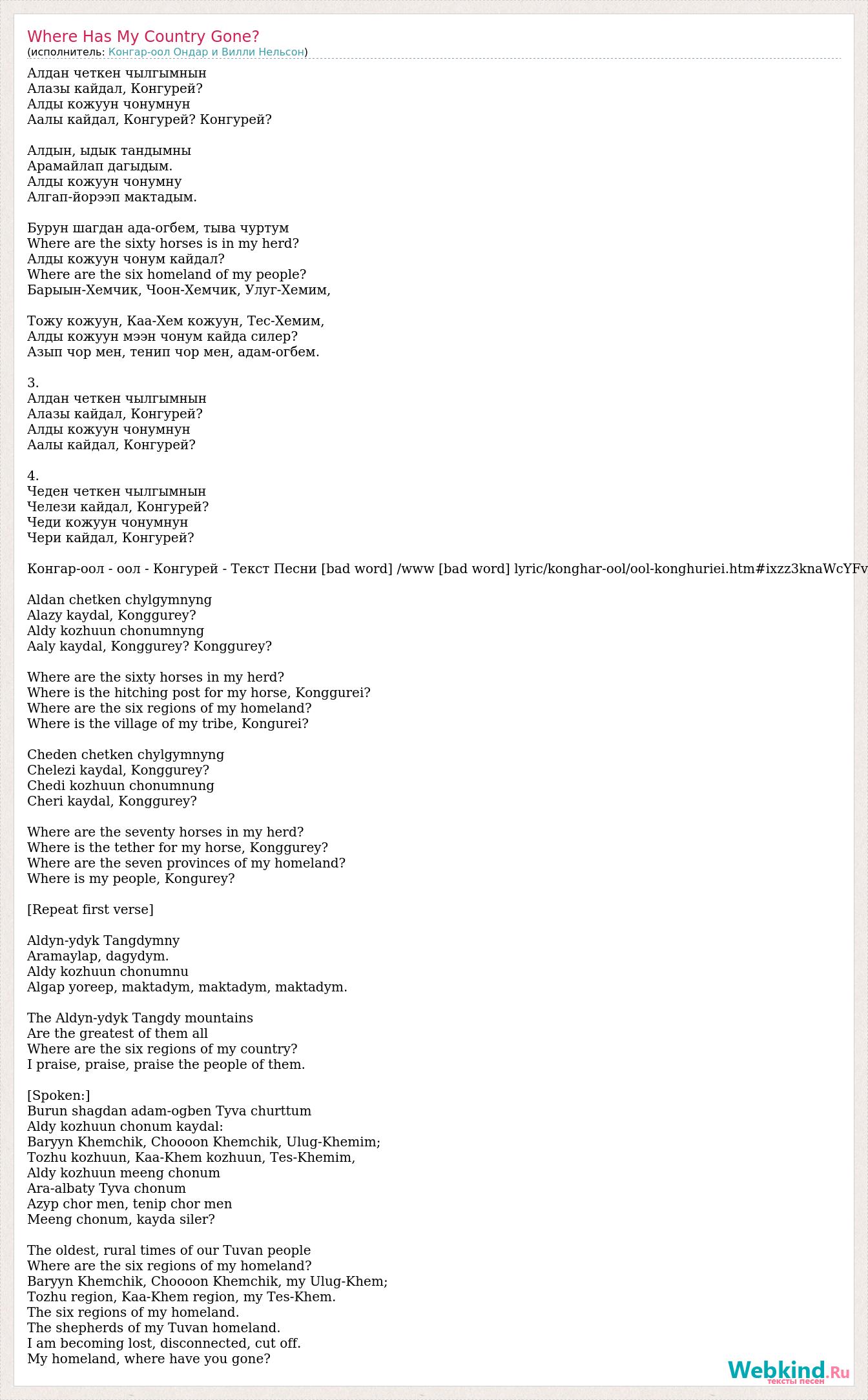 Алдан четкен чылгымнын Алазы кайдал, Конгурей? Алды кожуун чонумнун Аалы кайдал, Конгурей? Конгурей? Алдын, ыдык тандымны Арамайлап дагыдым. Алды кожуун чонумну Алгап-йорээп мактадым. Бурун шагдан ада-огбем, тыва чуртум Where are the sixty horses is in my herd? Алды кожуун чонум кайдал? Where are the six homeland of my people? Барыын-Хемчик, Чоон-Хемчик, Улуг-Хемим, Тожу кожуун, Каа-Хем кожуун, Тес-Хемим, Алды кожуун мээн чонум кайда силер? Азып чор мен, тенип чор мен, адам-огбем. 3. Алдан четкен чылгымнын Алазы кайдал, Конгурей? Алды кожуун чонумнун Аалы кайдал, Конгурей? 4. Чеден четкен чылгымнын Челези кайдал, Конгурей? Чеди кожуун чонумнун Чери кайдал, Конгурей? Конгар-оол - оол - Конгурей - Текст Песни [bad word] /www [bad word] lyric/konghar-ool/ool-konghuriei.htm#ixzz3knaWcYFv Aldan chetken chylgymnyng Alazy kaydal, Konggurey? Aldy kozhuun chonumnyng Aaly kaydal, Konggurey? Konggurey? Where are the sixty horses in my herd? Where is the hitching post for my horse, Konggurei? Where are the six regions of my homeland? Where is the village of my tribe, Kongurei? Cheden chetken chylgymnyng Chelezi kaydal, Konggurey? Chedi kozhuun chonumnung Cheri kaydal, Konggurey? Where are the seventy horses in my herd? Where is the tether for my horse, Konggurey? Where are the seven provinces of my homeland? Where is my people, Kongurey? [Repeat first verse] Aldyn-ydyk Tangdymny Aramaylap, dagydym. Aldy kozhuun chonumnu Algap yoreep, maktadym, maktadym, maktadym. The Aldyn-ydyk Tangdy mountains Are the greatest of them all Where are the six regions of my country? I praise, praise, praise the people of them. [Spoken:] Burun shagdan adam-ogben Tyva churttum Aldy kozhuun chonum kaydal: Baryyn Khemchik, Choooon Khemchik, Ulug-Khemim; Tozhu kozhuun, Kaa-Khem kozhuun, Tes-Khemim, Aldy kozhuun meeng chonum Ara-albaty Tyva chonum Azyp chor men, tenip chor men Meeng chonum, kayda siler? The oldest, rural times of our Tuvan people Where are the six regions of my homeland? Baryyn Khemchik, Choooon Khemchik, my Ulug-Khem; Tozhu region, Kaa-Khem region, my Tes-Khem. The six regions of my homeland. The shepherds of my Tuvan homeland. I am becoming lost, disconnected, cut off. My homeland, where have you gone?
