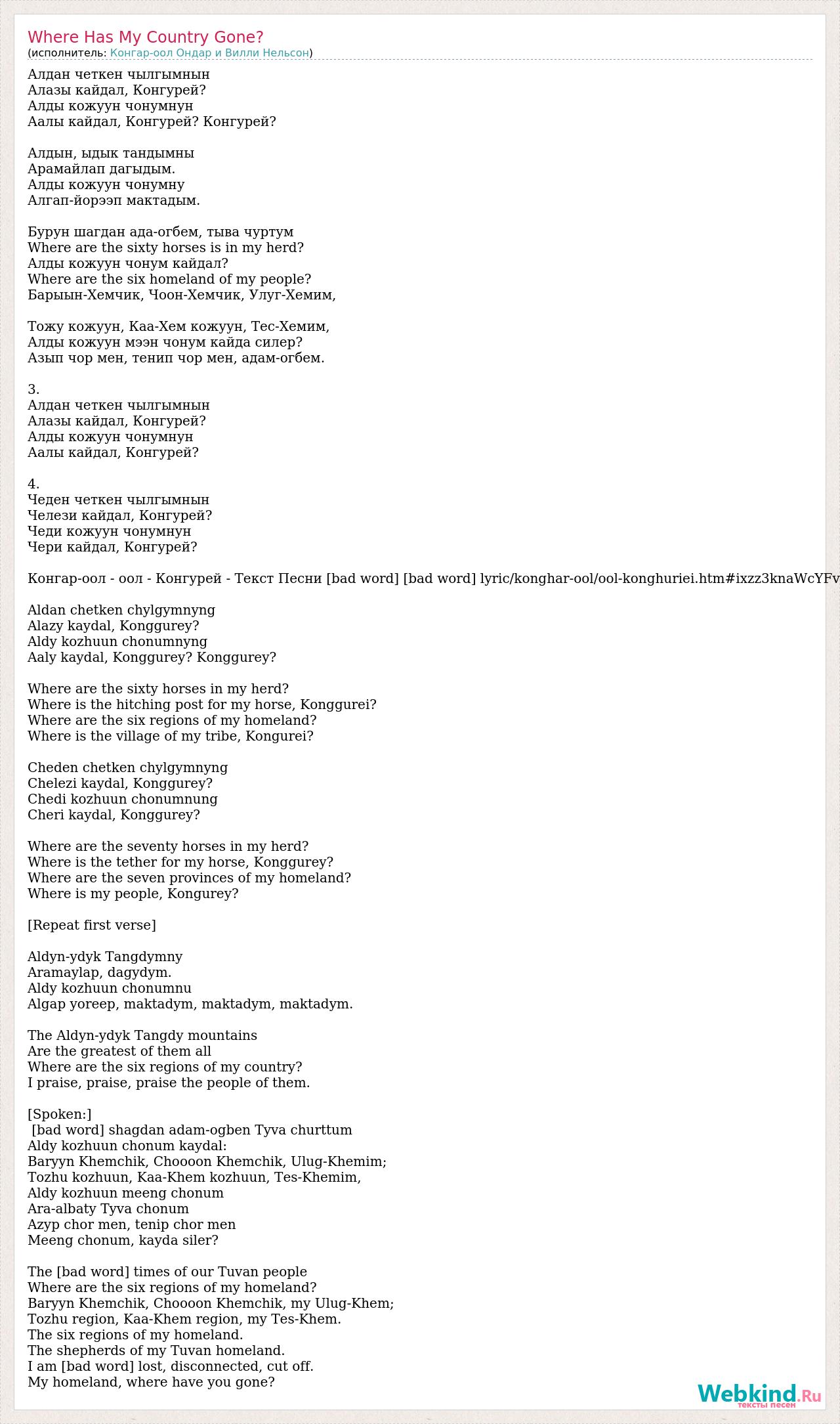 Алдан четкен чылгымнын Алазы кайдал, Конгурей? Алды кожуун чонумнун Аалы кайдал, Конгурей? Конгурей? Алдын, ыдык тандымны Арамайлап дагыдым. Алды кожуун чонумну Алгап-йорээп мактадым. Бурун шагдан ада-огбем, тыва чуртум Where are the sixty horses is in my herd? Алды кожуун чонум кайдал? Where are the six homeland of my people? Барыын-Хемчик, Чоон-Хемчик, Улуг-Хемим, Тожу кожуун, Каа-Хем кожуун, Тес-Хемим, Алды кожуун мээн чонум кайда силер? Азып чор мен, тенип чор мен, адам-огбем. 3. Алдан четкен чылгымнын Алазы кайдал, Конгурей? Алды кожуун чонумнун Аалы кайдал, Конгурей? 4. Чеден четкен чылгымнын Челези кайдал, Конгурей? Чеди кожуун чонумнун Чери кайдал, Конгурей? Конгар-оол - оол - Конгурей - Текст Песни [bad word] [bad word] lyric/konghar-ool/ool-konghuriei.htm#ixzz3knaWcYFv Aldan chetken chylgymnyng Alazy kaydal, Konggurey? Aldy kozhuun chonumnyng Aaly kaydal, Konggurey? Konggurey? Where are the sixty horses in my herd? Where is the hitching post for my horse, Konggurei? Where are the six regions of my homeland? Where is the village of my tribe, Kongurei? Cheden chetken chylgymnyng Chelezi kaydal, Konggurey? Chedi kozhuun chonumnung Cheri kaydal, Konggurey? Where are the seventy horses in my herd? Where is the tether for my horse, Konggurey? Where are the seven provinces of my homeland? Where is my people, Kongurey? [Repeat first verse] Aldyn-ydyk Tangdymny Aramaylap, dagydym. Aldy kozhuun chonumnu Algap yoreep, maktadym, maktadym, maktadym. The Aldyn-ydyk Tangdy mountains Are the greatest of them all Where are the six regions of my country? I praise, praise, praise the people of them. [Spoken:] [bad word] shagdan adam-ogben Tyva churttum Aldy kozhuun chonum kaydal: Baryyn Khemchik, Choooon Khemchik, Ulug-Khemim; Tozhu kozhuun, Kaa-Khem kozhuun, Tes-Khemim, Aldy kozhuun meeng chonum Ara-albaty Tyva chonum Azyp chor men, tenip chor men Meeng chonum, kayda siler? The [bad word] times of our Tuvan people Where are the six regions of my homeland? Baryyn Khemchik, Choooon Khemchik, my Ulug-Khem; Tozhu region, Kaa-Khem region, my Tes-Khem. The six regions of my homeland. The shepherds of my Tuvan homeland. I am [bad word] lost, disconnected, cut off. My homeland, where have you gone?