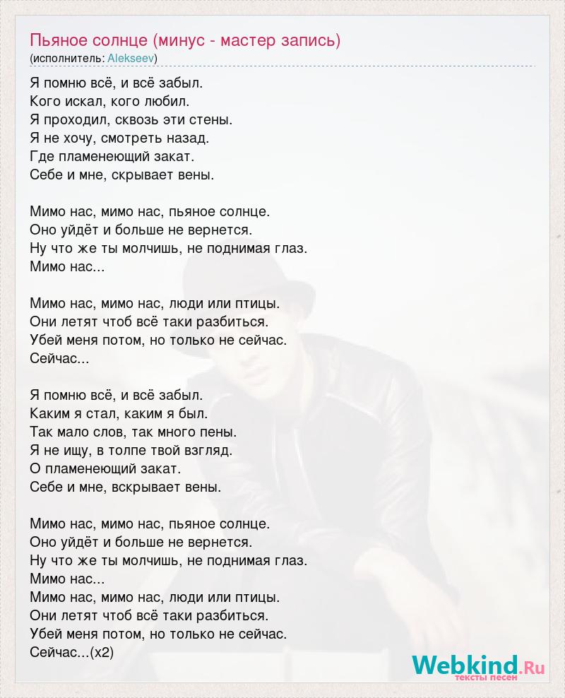 Я помню всё, и всё забыл. Кого искал, кого любил. Я проходил, сквозь эти стены. Я не хочу, смотреть назад. Где пламенеющий закат. Себе и мне, скрывает вены. Мимо нас, мимо нас, пьяное солнце. Оно уйдёт и больше не вернется. Ну что же ты молчишь, не поднимая глаз. Мимо нас... Мимо нас, мимо нас, люди или птицы. Они летят чтоб всё таки разбиться. Убей меня потом, но только не сейчас. Сейчас... Я помню всё, и всё забыл. Каким я стал, каким я был. Так мало слов, так много пены. Я не ищу, в толпе твой взгляд. О пламенеющий закат. Себе и мне, вскрывает вены. Мимо нас, мимо нас, пьяное солнце. Оно уйдёт и больше не вернется. Ну что же ты молчишь, не поднимая глаз. Мимо нас... Мимо нас, мимо нас, люди или птицы. Они летят чтоб всё таки разбиться. Убей меня потом, но только не сейчас. Сейчас...(х2)