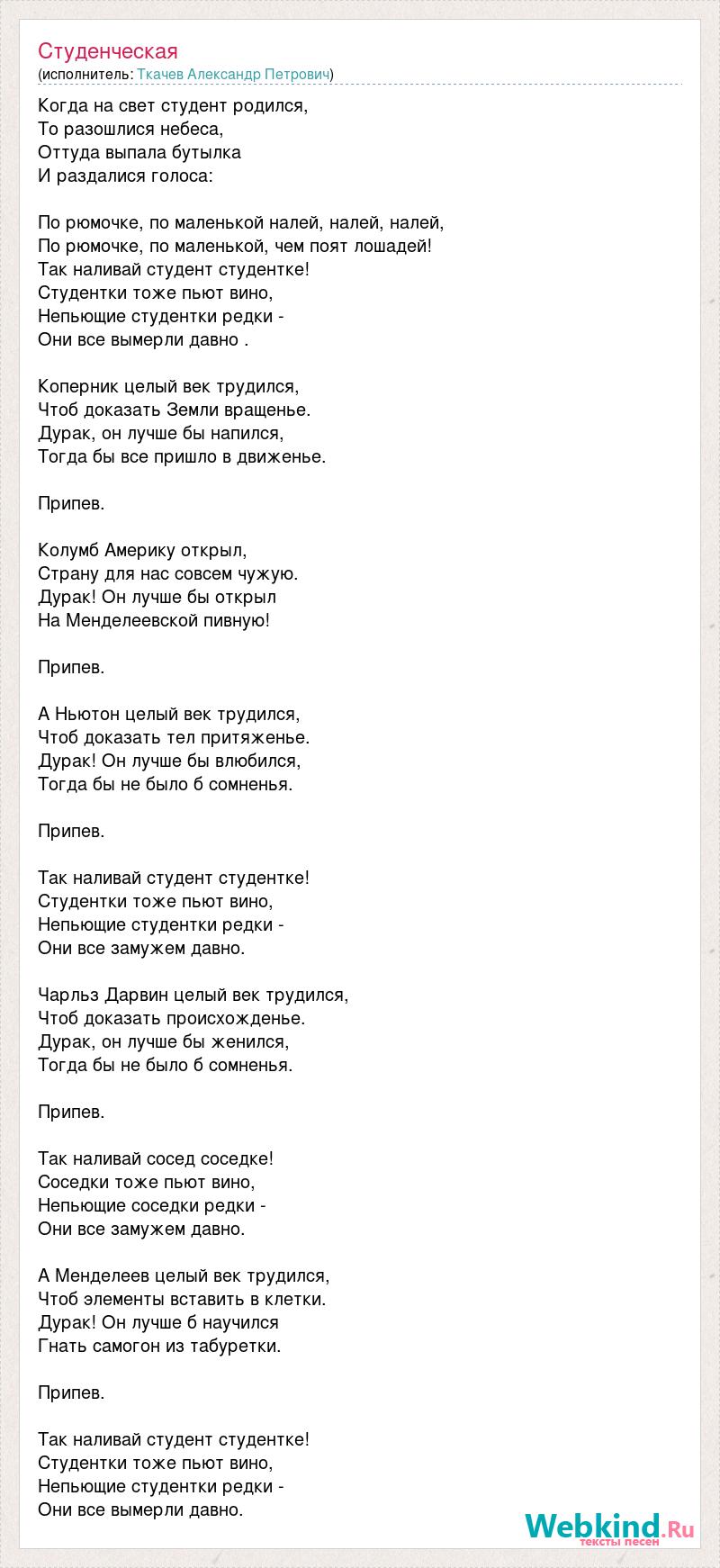 Когда на свет студент родился, То разошлися небеса, Оттуда выпала бутылка И раздалися голоса: По рюмочке, по маленькой налей, налей, налей, По рюмочке, по маленькой, чем поят лошадей! Так наливай студент студентке! Студентки тоже пьют вино, Непьющие студентки редки - Они все вымерли давно . Коперник целый век трудился, Чтоб доказать Земли вращенье. Дурак, он лучше бы напился, Тогда бы все пришло в движенье. Припев. Колумб Америку открыл, Страну для нас совсем чужую. Дурак! Он лучше бы открыл На Менделеевской пивную! Припев. А Ньютон целый век трудился, Чтоб доказать тел притяженье. Дурак! Он лучше бы влюбился, Тогда бы не было б сомненья. Припев. Так наливай студент студентке! Студентки тоже пьют вино, Непьющие студентки редки - Они все замужем давно. Чарльз Дарвин целый век трудился, Чтоб доказать происхожденье. Дурак, он лучше бы женился, Тогда бы не было б сомненья. Припев. Так наливай сосед соседке! Соседки тоже пьют вино, Непьющие соседки редки - Они все замужем давно. А Менделеев целый век трудился, Чтоб элементы вставить в клетки. Дурак! Он лучше б научился Гнать самогон из табуретки. Припев. Так наливай студент студентке! Студентки тоже пьют вино, Непьющие студентки редки - Они все вымерли давно.