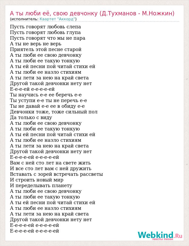 Пусть говорят любовь слепа Пусть говорят любовь глупа Пусть говорят что мы не пара А ты не верь не верь Приятель этой песне старой А ты люби ее свою девчонку А ты люби ее такую тонкую А ты ей песни пой читай стихи ей А ты люби ее назло стихиям А ты лети за нею на край света Другой такой девчонки нету нет Е-е-е-ей е-е-е-е-ей Ты научись е-е ее беречь е-е Ты уступи е-е ты не перечь е-е Ты не давай е-е ее в обиду е-е Девчонки тоже, тоже сильный пол Да только с виду А ты люби ее свою девчонку А ты люби ее такую тонкую А ты ей песни пой читай стихи ей А ты люби ее назло стихиям А ты лети за нею на край света Другой такой девчонки нету нет Е-е-е-е-ей е-е-е-е-ей Вам с ней сто лет на свете жить И все сто лет вам с ней дружить Вставать с зорей встречать рассветы И строить новый мир И переделывать планету А ты люби ее свою девчонку А ты люби ее такую тонкую А ты ей песни пой читай стихи ей А ты люби ее назло стихиям А ты лети за нею на край света Другой такой девчонки нету нет Е-е-е-е-ей е-е-е-е-ей Е-е-е-е-ей е-е-е-е-ей