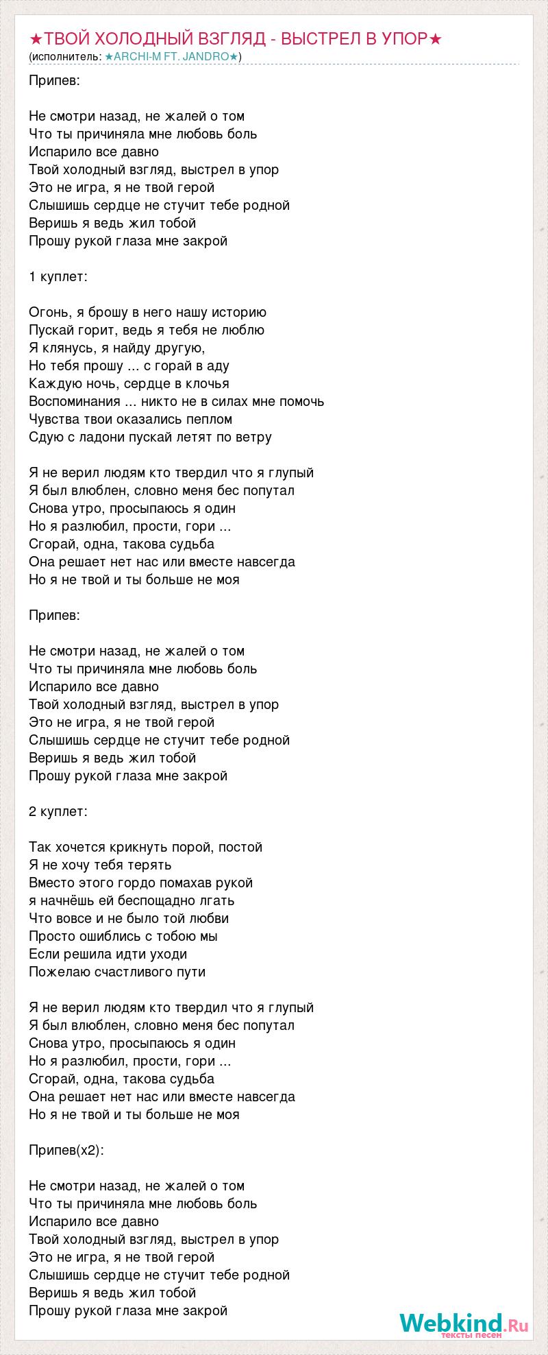 Припев: Не смотри назад, не жалей о том Что ты причиняла мне любовь боль Испарило все давно Твой холодный взгляд, выстрел в упор Это не игра, я не твой герой Слышишь сердце не стучит тебе родной Веришь я ведь жил тобой Прошу рукой глаза мне закрой 1 куплет: Огонь, я брошу в него нашу историю Пускай горит, ведь я тебя не люблю Я клянусь, я найду другую, Но тебя прошу ... с горай в аду Каждую ночь, сердце в клочья Воспоминания ... никто не в силах мне помочь Чувства твои оказались пеплом Сдую с ладони пускай летят по ветру Я не верил людям кто твердил что я глупый Я был влюблен, словно меня бес попутал Снова утро, просыпаюсь я один Но я разлюбил, прости, гори ... Сгорай, одна, такова судьба Она решает нет нас или вместе навсегда Но я не твой и ты больше не моя Припев: Не смотри назад, не жалей о том Что ты причиняла мне любовь боль Испарило все давно Твой холодный взгляд, выстрел в упор Это не игра, я не твой герой Слышишь сердце не стучит тебе родной Веришь я ведь жил тобой Прошу рукой глаза мне закрой 2 куплет: Так хочется крикнуть порой, постой Я не хочу тебя терять Вместо этого гордо помахав рукой я начнёшь ей беспощадно лгать Что вовсе и не было той любви Просто ошиблись с тобою мы Если решила идти уходи Пожелаю счастливого пути Я не верил людям кто твердил что я глупый Я был влюблен, словно меня бес попутал Снова утро, просыпаюсь я один Но я разлюбил, прости, гори ... Сгорай, одна, такова судьба Она решает нет нас или вместе навсегда Но я не твой и ты больше не моя Припев(x2): Не смотри назад, не жалей о том Что ты причиняла мне любовь боль Испарило все давно Твой холодный взгляд, выстрел в упор Это не игра, я не твой герой Слышишь сердце не стучит тебе родной Веришь я ведь жил тобой Прошу рукой глаза мне закрой