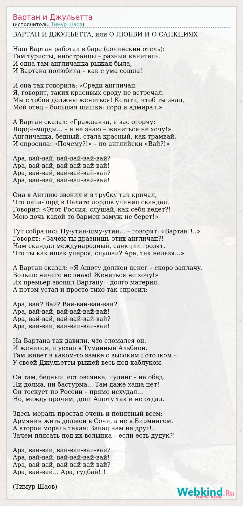 ВАРТАН И ДЖУЛЬЕТТА, или О ЛЮБВИ И О САНКЦИЯХ Наш Вартан работал в баре (сочинский отель): Там туристы, иностранцы – разный канитель. И одна там англичанка рыжая была, И Вартана полюбила – как с ума сошла! И она так говорила: «Среди англичан Я, говорит, таких красивых сроду не встречал. Мы с тобой должны жениться! Кстати, чтоб ты знал, Мой отец – большая шишка: лорд и адмирал.» А Вартан сказал: «Гражданка, я вас огорчу: Лорды-морды... – я не знаю – жениться не хочу!» Англичанка, бедный, стала красный, как трамвай, И спросила: «Почему?!» – по-английски «Вай?!» Ара, вай-вай, вай-вай-вай-вай? Ара, вай-вай, вай-вай-вай-вай! Ара, вай-вай, вай-вай-вай-вай? Ара, вай-вай, вай-вай-вай-вай! Она в Англию звонил и в трубку так кричал, Что папа-лорд в Палате лордов учинил скандал. Говорит: «Этот Россия, слушай, как себя ведет?! – Мою дочь какой-то бармен замуж не берет!» Тут собрались Пу-утин-шму-утин... – говорят: «Вартан!!..» Говорят: «Зачем ты дразнишь этих англичан?! Нам скандал международный, санкции грозят. Что ты как ишак уперся, слушай? Ара, так нельзя...» А Вартан сказал: «Я Ашоту должен денег – скоро заплачу. Больше ничего не знаю! Жениться не хочу!» Их премьер звонил Вартану – долго материл, А потом устал и просто тихо так спросил: Ара, вай? Вай? Вай-вай-вай-вай? Ара, вай-вай, вай-вай-вай-вай! Ара, вай-вай, вай-вай-вай-вай? Ара, вай-вай, вай-вай-вай-вай! На Вартана так давили, что сломался он. И женился, и уехал в Туманный Альбион. Там живет в каком-то замке с высоким потолком – У своей Джульетты рыжей весь под каблуком. Он там, бедный, ест овсянка; пудинг – на обед. Ни долма, ни бастурма... Там даже хаша нет! Он тоскует по России – прямо исхудал... Но, между прочим, долг Ашоту так и не отдал. Здесь мораль простая очень и понятный всем: Армянин жить должен в Сочи, а не в Бирмингем. А второй мораль такая: Запад нам не друг!.. Зачем плясать под их волынка – если есть дудук?! Ара, вай-вай, вай-вай-вай-вай? Ара, вай-вай, вай-вай-вай-вай! Ара, вай-вай, вай-вай-вай-вай? Ара, вай-вай... Ара, гудбай!!! (Тимур Шаов)