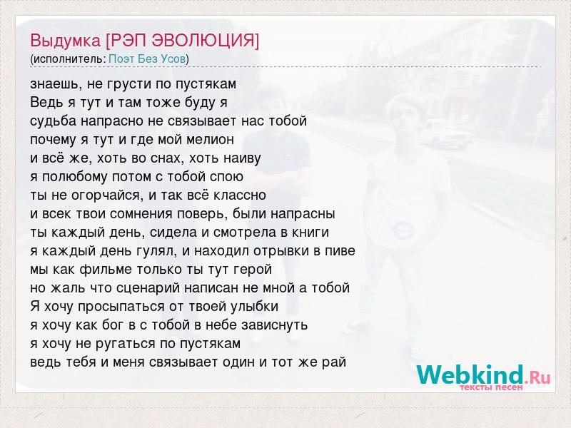 знаешь, не грусти по пустякам Ведь я тут и там тоже буду я судьба напрасно не связывает нас тобой почему я тут и где мой мелион и всё же, хоть во снах, хоть наиву я полюбому потом с тобой спою ты не огорчайся, и так всё классно и всек твои сомнения поверь, были напрасны ты каждый день, сидела и смотрела в книги я каждый день гулял, и находил отрывки в пиве мы как фильме только ты тут герой но жаль что сценарий написан не мной а тобой Я хочу просыпаться от твоей улыбки я хочу как бог в с тобой в небе зависнуть я хочу не ругаться по пустякам ведь тебя и меня связывает один и тот же рай