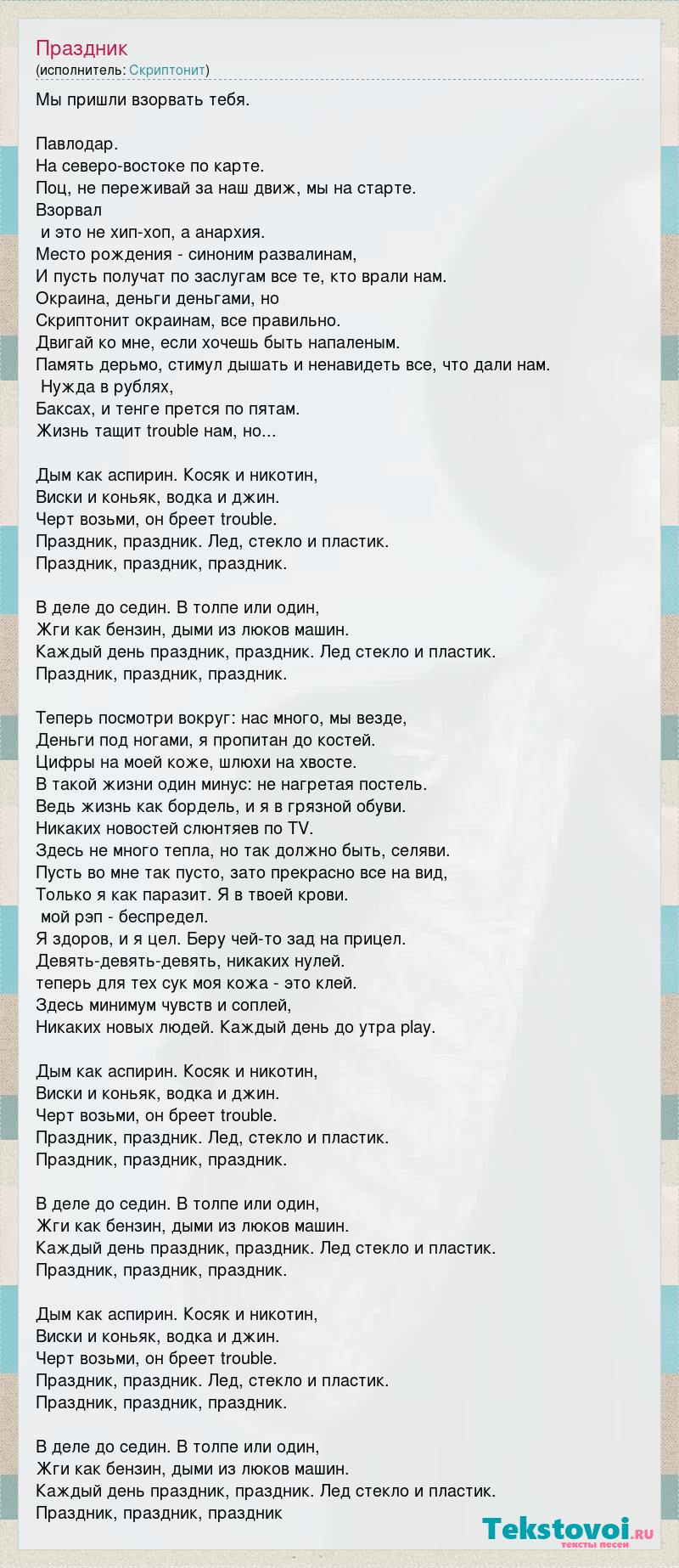 Мы пришли взорвать тебя. Павлодар. На северо-востоке по карте. Поц, не переживай за наш движ, мы на старте. Взорвал и это не хип-хоп, а анархия. Место рождения - синоним развалинам, И пусть получат по заслугам все те, кто врали нам. Окраина, деньги деньгами, но Скриптонит окраинам, все правильно. Двигай ко мне, если хочешь быть напаленым. Память дерьмо, стимул дышать и ненавидеть все, что дали нам. Нужда в рублях, Баксах, и тенге прется по пятам. Жизнь тащит trouble нам, но... Дым как аспирин. Косяк и никотин, Виски и коньяк, водка и джин. Черт возьми, он бреет trouble. Праздник, праздник. Лед, стекло и пластик. Праздник, праздник, праздник. В деле до седин. В толпе или один, Жги как бензин, дыми из люков машин. Каждый день праздник, праздник. Лед стекло и пластик. Праздник, праздник, праздник. Теперь посмотри вокруг: нас много, мы везде, Деньги под ногами, я пропитан до костей. Цифры на моей коже, шлюхи на хвосте. В такой жизни один минус: не нагретая постель. Ведь жизнь как бордель, и я в грязной обуви. Никаких новостей слюнтяев по TV. Здесь не много тепла, но так должно быть, селяви. Пусть во мне так пусто, зато прекрасно все на вид, Только я как паразит. Я в твоей крови. мой рэп - беспредел. Я здоров, и я цел. Беру чей-то зад на прицел. Девять-девять-девять, никаких нулей. теперь для тех сук моя кожа - это клей. Здесь минимум чувств и соплей, Никаких новых людей. Каждый день до утра play. Дым как аспирин. Косяк и никотин, Виски и коньяк, водка и джин. Черт возьми, он бреет trouble. Праздник, праздник. Лед, стекло и пластик. Праздник, праздник, праздник. В деле до седин. В толпе или один, Жги как бензин, дыми из люков машин. Каждый день праздник, праздник. Лед стекло и пластик. Праздник, праздник, праздник. Дым как аспирин. Косяк и никотин, Виски и коньяк, водка и джин. Черт возьми, он бреет trouble. Праздник, праздник. Лед, стекло и пластик. Праздник, праздник, праздник. В деле до седин. В толпе или один, Жги как бензин, дыми из люков машин. Каждый день праздник, праздник. Лед стекло и пластик. Праздник, праздник, праздник