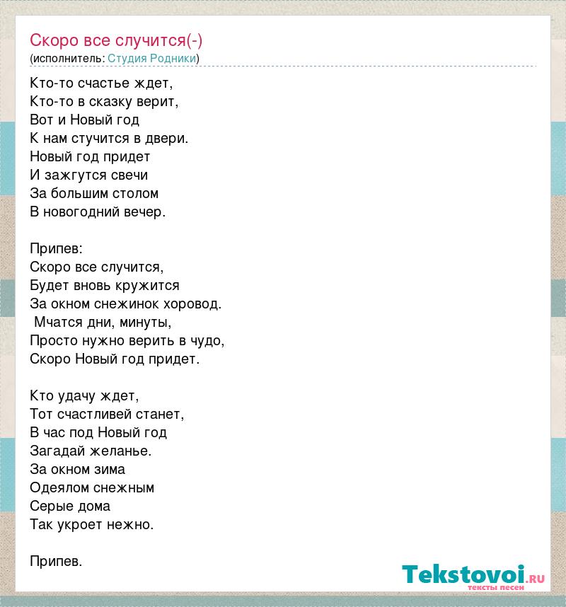Кто-то счастье ждет, Кто-то в сказку верит, Вот и Новый год К нам стучится в двери. Новый год придет И зажгутся свечи За большим столом В новогодний вечер. Припев: Скоро все случится, Будет вновь кружится За окном снежинок хоровод. Мчатся дни, минуты, Просто нужно верить в чудо, Скоро Новый год придет. Кто удачу ждет, Тот счастливей станет, В час под Новый год Загадай желанье. За окном зима Одеялом снежным Серые дома Так укроет нежно. Припев.