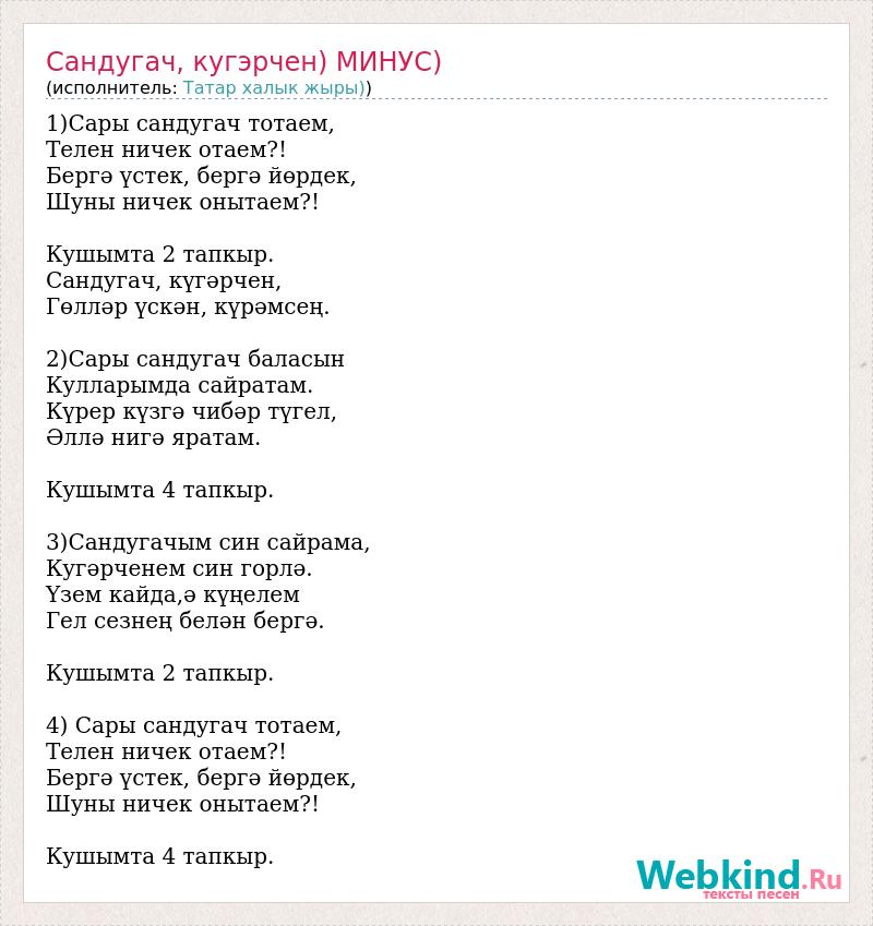 1)Сары сандугач тотаем, Телен ничек отаем?! Бергә үстек, бергә йөрдек, Шуны ничек онытаем?! Кушымта 2 тапкыр. Сандугач, күгәрчен, Гөлләр үскән, күрәмсең. 2)Сары сандугач баласын Кулларымда сайратам. Күрер күзгә чибәр түгел, Әллә нигә яратам. Кушымта 4 тапкыр. 3)Сандугачым син сайрама, Кугәрченем син горлә. Үзем кайда,ә күңелем Гел сезнең белән бергә. Кушымта 2 тапкыр. 4) Сары сандугач тотаем, Телен ничек отаем?! Бергә үстек, бергә йөрдек, Шуны ничек онытаем?! Кушымта 4 тапкыр.