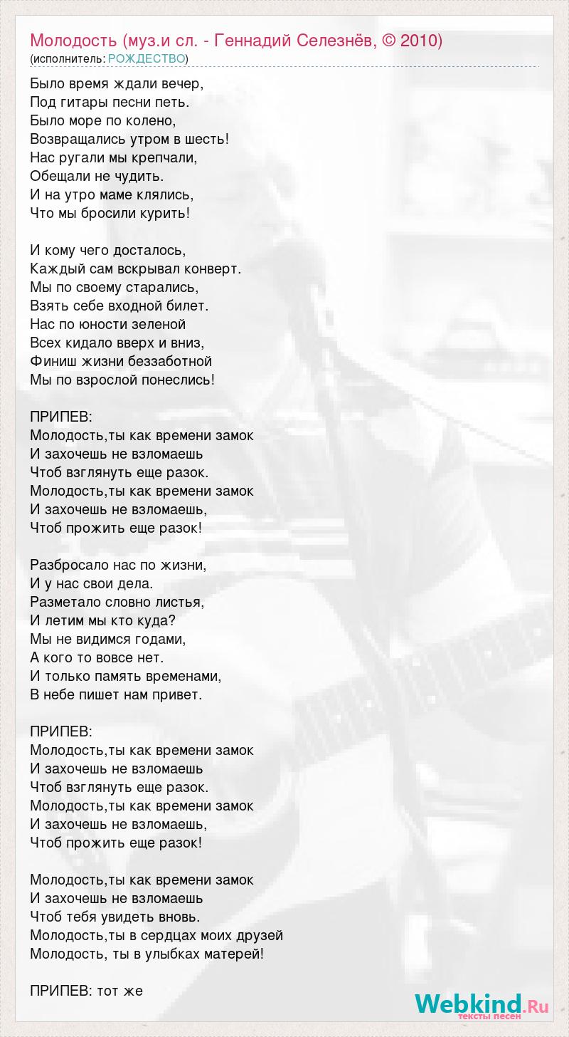 Было время ждали вечер, Под гитары песни петь. Было море по колено, Возвращались утром в шесть! Нас ругали мы крепчали, Обещали не чудить. И на утро маме клялись, Что мы бросили курить! И кому чего досталось, Каждый сам вскрывал конверт. Мы по своему старались, Взять себе входной билет. Нас по юности зеленой Всех кидало вверх и вниз, Финиш жизни беззаботной Мы по взрослой понеслись! ПРИПЕВ: Молодость,ты как времени замок И захочешь не взломаешь Чтоб взглянуть еще разок. Молодость,ты как времени замок И захочешь не взломаешь, Чтоб прожить еще разок! Разбросало нас по жизни, И у нас свои дела. Разметало словно листья, И летим мы кто куда? Мы не видимся годами, А кого то вовсе нет. И только память временами, В небе пишет нам привет. ПРИПЕВ: Молодость,ты как времени замок И захочешь не взломаешь Чтоб взглянуть еще разок. Молодость,ты как времени замок И захочешь не взломаешь, Чтоб прожить еще разок! Молодость,ты как времени замок И захочешь не взломаешь Чтоб тебя увидеть вновь. Молодость,ты в сердцах моих друзей Молодость, ты в улыбках матерей! ПРИПЕВ: тот же