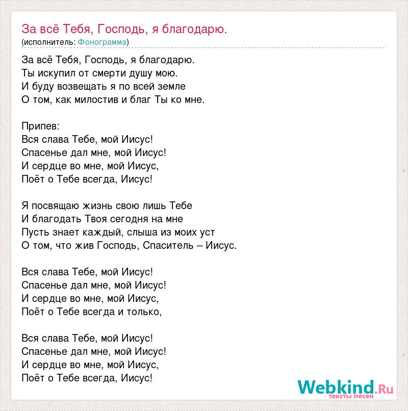 За всё Тебя, Господь, я благодарю. Ты искупил от смерти душу мою. И буду возвещать я по всей земле О том, как милостив и благ Ты ко мне. Припев: Вся слава Тебе, мой Иисус! Спасенье дал мне, мой Иисус! И сердце во мне, мой Иисус, Поёт о Тебе всегда, Иисус! Я посвящаю жизнь свою лишь Тебе И благодать Твоя сегодня на мне Пусть знает каждый, слыша из моих уст О том, что жив Господь, Спаситель – Иисус. Вся слава Тебе, мой Иисус! Спасенье дал мне, мой Иисус! И сердце во мне, мой Иисус, Поёт о Тебе всегда и только, Вся слава Тебе, мой Иисус! Спасенье дал мне, мой Иисус! И сердце во мне, мой Иисус, Поёт о Тебе всегда, Иисус!