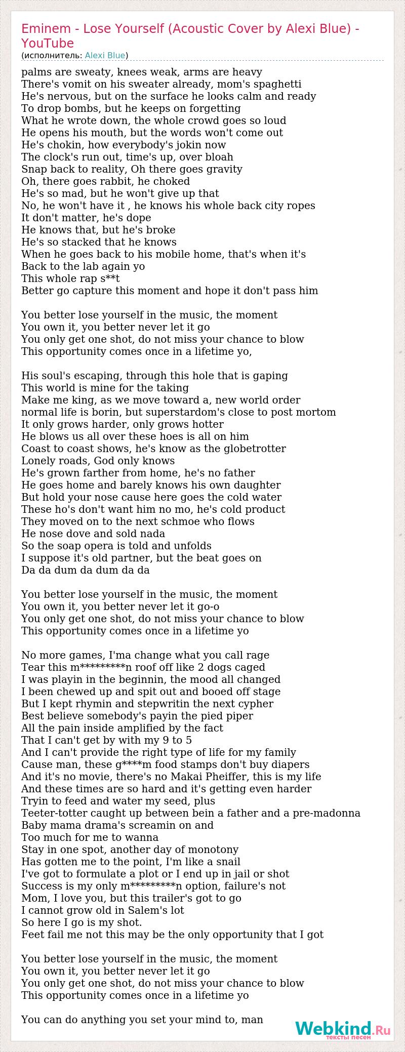 А как ты думаешь, о чем песня "Eminem - Lose Yourself (Acoustic Cover by Alexi Blue) - YouTube" ?