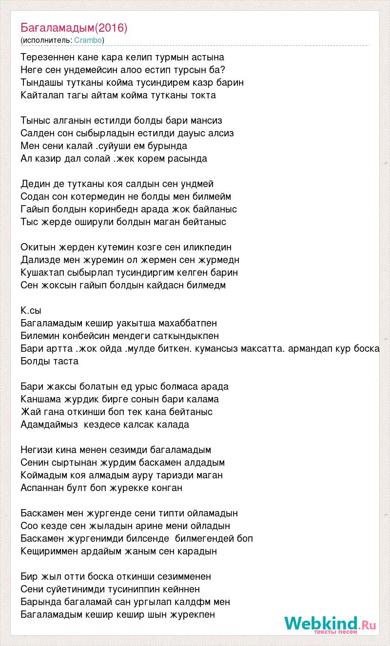 Терезеннен кане кара келип турмын астына Неге сен ундемейсин алоо естип турсын ба? Тындашы тутканы койма тусиндирем казр барин Кайталап тагы айтам койма тутканы токта Тыныс алганын естилди болды бари мансиз Салден сон сыбырладын естилди дауыс алсиз Мен сени калай .суйуши ем бурында Ал казир дал солай .жек корем расында Дедин де тутканы коя салдын сен ундмей Содан сон котермедин не болды мен билмейм Гайып болдын коринбедн арада жок байланыс Тыс жерде оширули болдын маган бейтаныс Окитын жерден кутемин козге сен иликпедин Дализде мен журемин ол жермен сен журмедн Кушактап сыбырлап тусиндиргим келген барин Сен жоксын гайып болдын кайдасн билмедм К.сы Багаламадым кешир уакытша махаббатпен Билемин конбейсин мендеги саткындыкпен Бари артта .жок ойда .мулде биткен. кумансыз максатта. армандап кур боска Болды таста Бари жаксы болатын ед урыс болмаса арада Каншама журдик бирге сонын бари калама Жай гана откинши боп тек кана бейтаныс Адамдаймыз кездесе калсак калада Негизи кина менен сезимди багаламадым Сенин сыртынан журдим баскамен алдадым Коймадым коя алмадым ауру таризди маган Аспаннан булт боп журекке конган Баскамен мен жургенде сени типти ойламадын Соо кезде сен жыладын арине мени ойладын Баскамен жургенимди билсенде билмегендей боп Кещириммен ардайым жаным сен карадын Бир жыл отти боска откинши сезимменен Сени суйетинимди тусиниппин кейннен Барында багаламай сан ургылап калдфм мен Багаламадым кешир кешир шын журекпен
