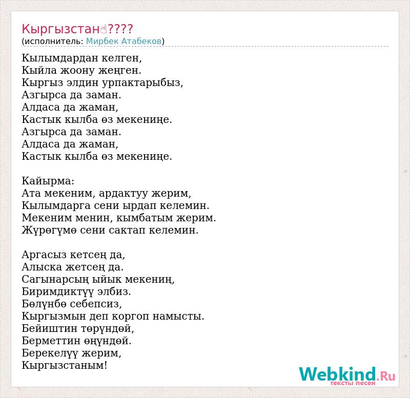 Кылымдардан келген, Кыйла жоону жеңген. Кыргыз элдин урпактарыбыз, Азгырса да заман. Алдаса да жаман, Кастык кылба өз мекениңе. Азгырса да заман. Алдаса да жаман, Кастык кылба өз мекениңе. Кайырма: Ата мекеним, ардактуу жерим, Кылымдарга сени ырдап келемин. Мекеним менин, кымбатым жерим. Жүрөгүмө сени сактап келемин. Аргасыз кетсең да, Алыска жетсең да. Сагынарсың ыйык мекениң, Биримдиктүү элбиз. Бөлүнбө себепсиз, Кыргызмын деп коргоп намысты. Бейиштин төрүндөй, Берметтин өңүндөй. Берекелүү жерим, Кыргызстаным!