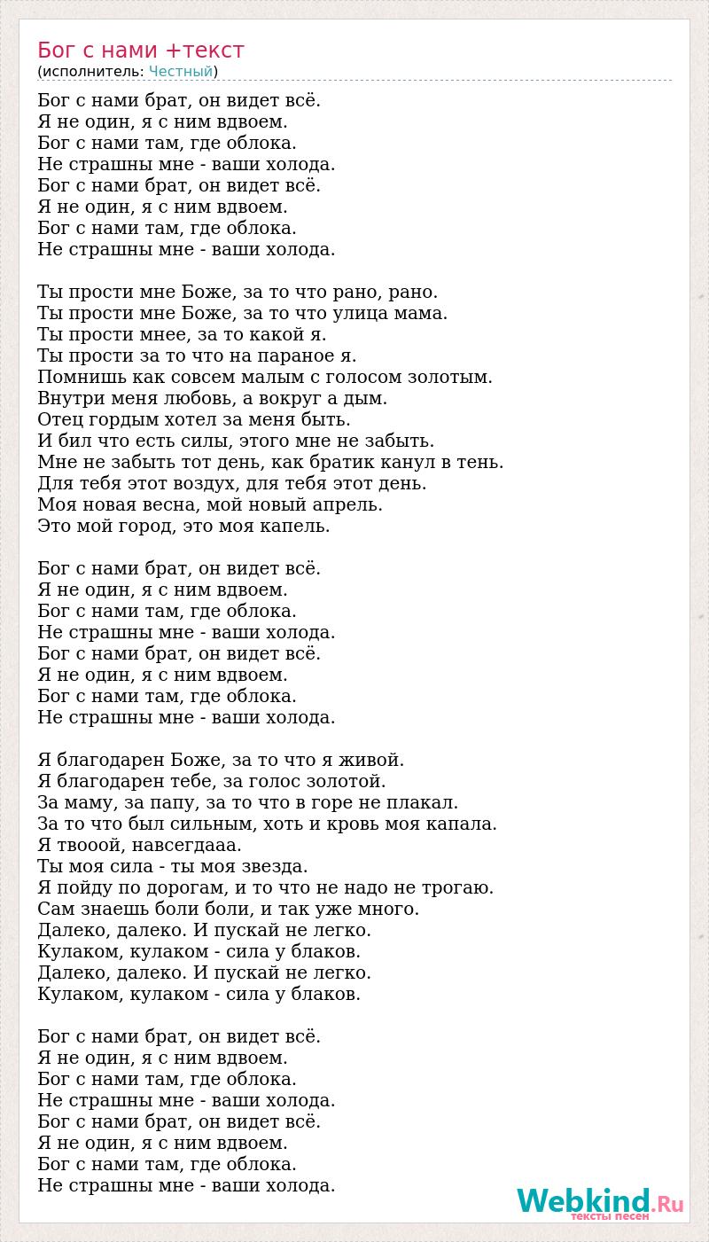 Бог с нами брат, он видет всё. Я не один, я с ним вдвоем. Бог с нами там, где облока. Не страшны мне - ваши холода. Бог с нами брат, он видет всё. Я не один, я с ним вдвоем. Бог с нами там, где облока. Не страшны мне - ваши холода. Ты прости мне Боже, за то что рано, рано. Ты прости мне Боже, за то что улица мама. Ты прости мнее, за то какой я. Ты прости за то что на параное я. Помнишь как совсем малым с голосом золотым. Внутри меня любовь, а вокруг а дым. Отец гордым хотел за меня быть. И бил что есть силы, этого мне не забыть. Мне не забыть тот день, как братик канул в тень. Для тебя этот воздух, для тебя этот день. Моя новая весна, мой новый апрель. Это мой город, это моя капель. Бог с нами брат, он видет всё. Я не один, я с ним вдвоем. Бог с нами там, где облока. Не страшны мне - ваши холода. Бог с нами брат, он видет всё. Я не один, я с ним вдвоем. Бог с нами там, где облока. Не страшны мне - ваши холода. Я благодарен Боже, за то что я живой. Я благодарен тебе, за голос золотой. За маму, за папу, за то что в горе не плакал. За то что был сильным, хоть и кровь моя капала. Я твооой, навсегдааа. Ты моя сила - ты моя звезда. Я пойду по дорогам, и то что не надо не трогаю. Сам знаешь боли боли, и так уже много. Далеко, далеко. И пускай не легко. Кулаком, кулаком - сила у блаков. Далеко, далеко. И пускай не легко. Кулаком, кулаком - сила у блаков. Бог с нами брат, он видет всё. Я не один, я с ним вдвоем. Бог с нами там, где облока. Не страшны мне - ваши холода. Бог с нами брат, он видет всё. Я не один, я с ним вдвоем. Бог с нами там, где облока. Не страшны мне - ваши холода.