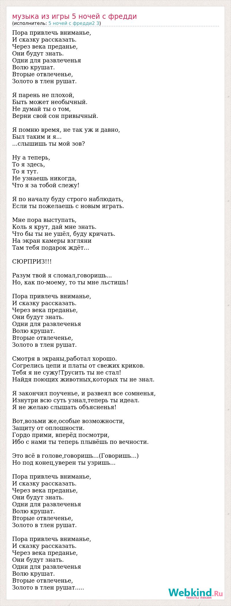Пора привлечь вниманье, И сказку рассказать. Через века преданье, Они будут знать. Одни для развлеченья Волю крушат. Вторые отвлеченье, Золото в тлен рушат. Я парень не плохой, Быть может необычный. Не думай ты о том, Верни свой сон привычный. Я помню время, не так уж и давно, Был таким и я... ...слышишь ты мой зов? Ну а теперь, То я здесь, То я тут. Не узнаешь никогда, Что я за тобой слежу! Я по началу буду строго наблюдать, Если ты пожелаешь с новым играть. Мне пора выступать, Коль я крут, дай мне знать. Что бы ты не ушёл, буду кричать. На экран камеры взгляни Там тебя подарок ждёт... СЮРПРИЗ!!! Разум твой я сломал,говоришь... Но, как по-моему, то ты мне льстишь! Пора привлечь вниманье, И сказку рассказать. Через века преданье, Они будут знать. Одни для развлеченья Волю крушат. Вторые отвлеченье, Золото в тлен рушат. Смотря в экраны,работал хорошо. Согрелись цепи и платы от свежих криков. Тебя я не сужу!Трусить ты не стал! Найдя поющих животных,которых ты не знал. Я закончил поученье, и развеял все сомненья, Изнутри всю суть узнал,теперь ты идеал. Я не желаю слышать объясненья! Вот,возьми же,особые возможности, Защиту от оплошности. Гордо прими, вперёд посмотри, Ибо с нами ты теперь плывёшь по вечности. Это всё в голове,говоришь...(Говоришь...) Но под конец,уверен ты узришь... Пора привлечь вниманье, И сказку рассказать. Через века преданье, Они будут знать. Одни для развлеченья Волю крушат. Вторые отвлеченье, Золото в тлен рушат. Пора привлечь вниманье, И сказку рассказать. Через века преданье, Они будут знать. Одни для развлеченья Волю крушат. Вторые отвлеченье, Золото в тлен рушат.....