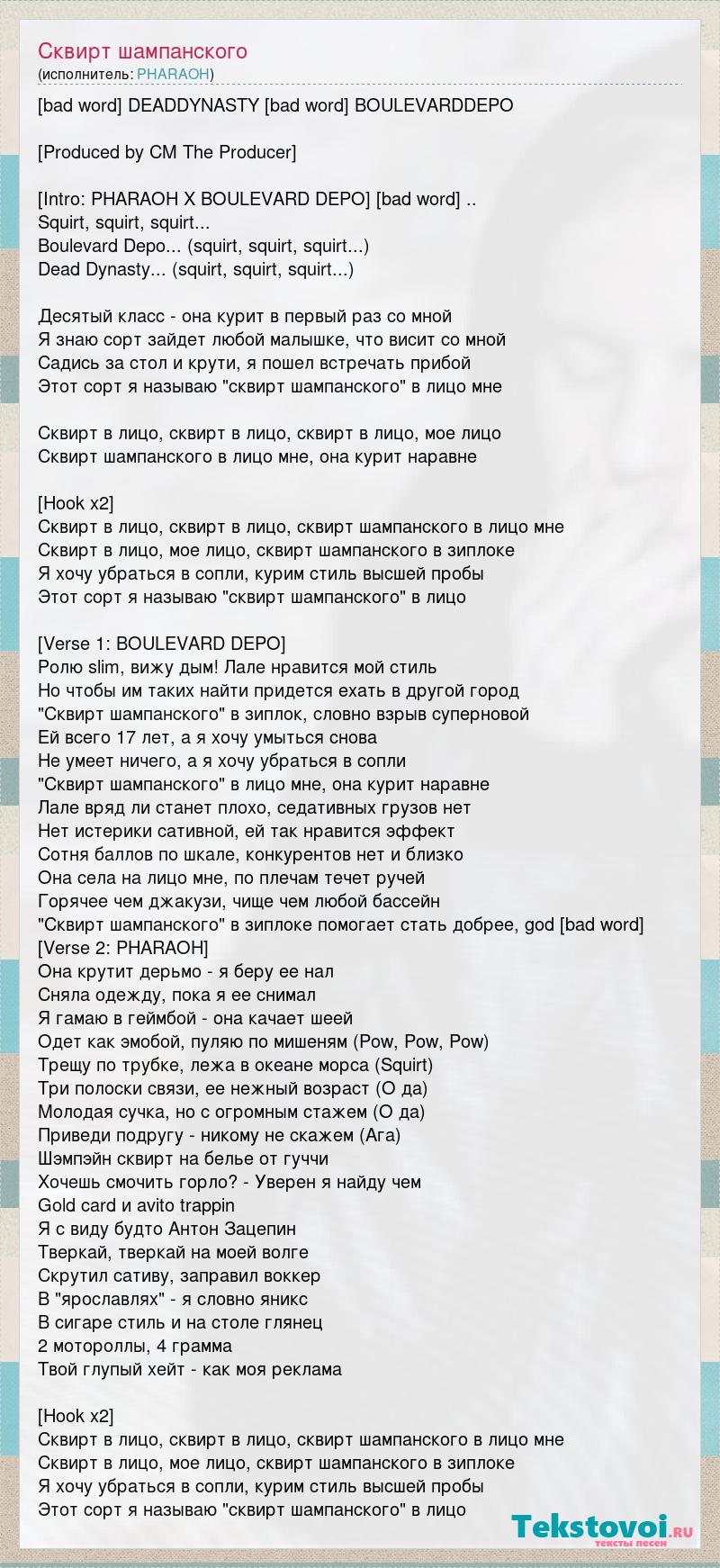 [bad word] DEADDYNASTY [bad word] BOULEVARDDEPO [Produced by CM The Producer] [Intro: PHARAOH X BOULEVARD DEPO] [bad word] .. Squirt, squirt, squirt... Boulevard Depo... (squirt, squirt, squirt...) Dead Dynasty... (squirt, squirt, squirt...) Десятый класс - она курит в первый раз со мной Я знаю сорт зайдет любой малышке, что висит со мной Садись за стол и крути, я пошел встречать прибой Этот сорт я называю "сквирт шампанского" в лицо мне Сквирт в лицо, сквирт в лицо, сквирт в лицо, мое лицо Сквирт шампанского в лицо мне, она курит наравне [Hook x2] Сквирт в лицо, сквирт в лицо, сквирт шампанского в лицо мне Сквирт в лицо, мое лицо, сквирт шампанского в зиплоке Я хочу убраться в сопли, курим стиль высшей пробы Этот сорт я называю "сквирт шампанского" в лицо [Verse 1: BOULEVARD DEPO] Ролю slim, вижу дым! Лале нравится мой стиль Но чтобы им таких найти придется ехать в другой город "Сквирт шампанского" в зиплок, словно взрыв суперновой Ей всего 17 лет, а я хочу умыться снова Не умеет ничего, а я хочу убраться в сопли "Сквирт шампанского" в лицо мне, она курит наравне Лале вряд ли станет плохо, седативных грузов нет Нет истерики сативной, ей так нравится эффект Сотня баллов по шкале, конкурентов нет и близко Она села на лицо мне, по плечам течет ручей Горячее чем джакузи, чище чем любой бассейн "Сквирт шампанского" в зиплоке помогает стать добрее, god [bad word] [Verse 2: PHARAOH] Она крутит дерьмо - я беру ее нал Сняла одежду, пока я ее снимал Я гамаю в геймбой - она качает шеей Одет как эмобой, пуляю по мишеням (Pow, Pow, Pow) Трещу по трубке, лежа в океане морса (Squirt) Три полоски связи, ее нежный возраст (О да) Молодая сучка, но с огромным стажем (О да) Приведи подругу - никому не скажем (Ага) Шэмпэйн сквирт на белье от гуччи Хочешь смочить горло? - Уверен я найду чем Gold card и avito trappin Я с виду будто Антон Зацепин Тверкай, тверкай на моей волге Скрутил сативу, заправил воккер В "ярославлях" - я словно яникс В сигаре стиль и на столе глянец 2 мотороллы, 4 грамма Твой глупый хейт - как моя реклама [Hook x2] Сквирт в лицо, сквирт в лицо, сквирт шампанского в лицо мне Сквирт в лицо, мое лицо, сквирт шампанского в зиплоке Я хочу убраться в сопли, курим стиль высшей пробы Этот сорт я называю "сквирт шампанского" в лицо