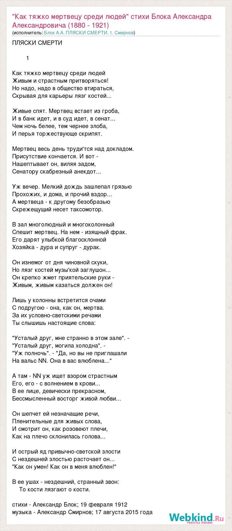 Главная→Исполнители→Блок А.А. ПЛЯСКИ СМЕРТИ. 1. Смирнов→"Как тяжко мертвецу среди людей" стихи Блока Александра Александровича (1880 - 1