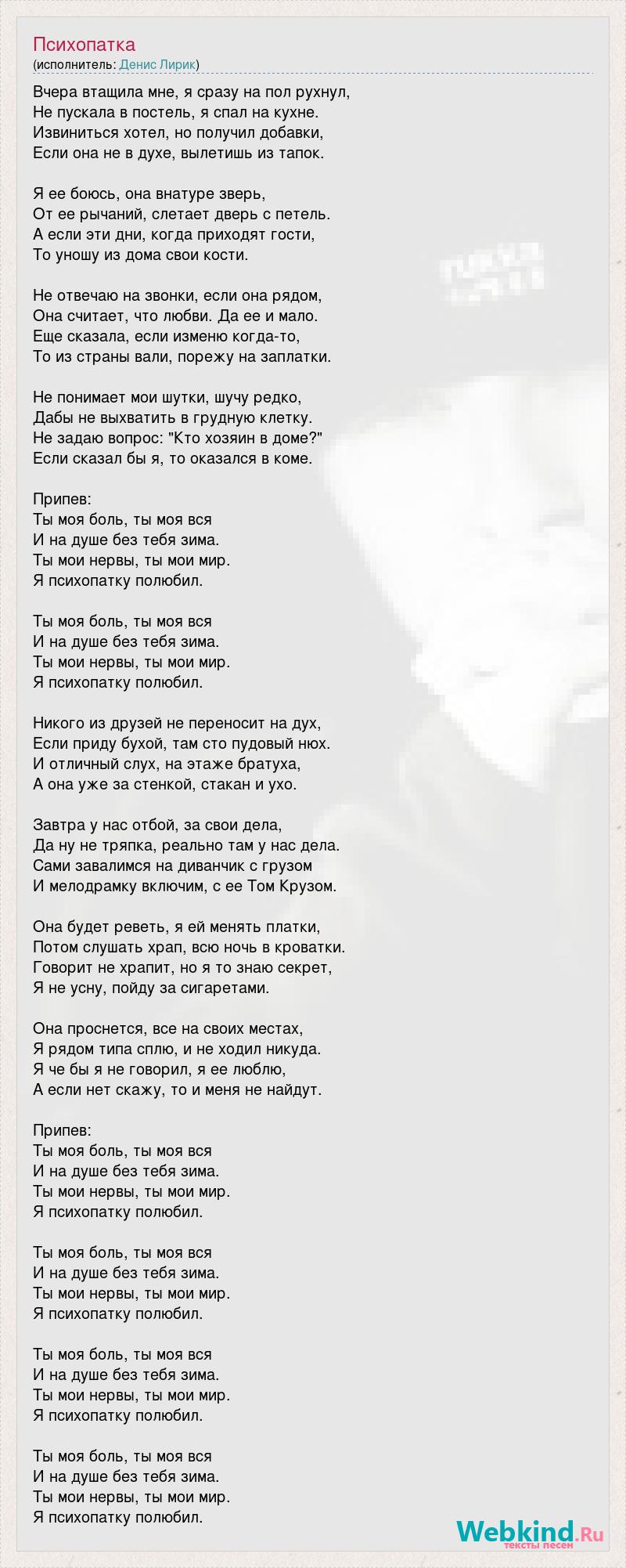 Вчера втащила мне, я сразу на пол рухнул, Не пускала в постель, я спал на кухне. Извиниться хотел, но получил добавки, Если она не в духе, вылетишь из тапок. Я ее боюсь, она внатуре зверь, От ее рычаний, слетает дверь с петель. А если эти дни, когда приходят гости, То уношу из дома свои кости. Не отвечаю на звонки, если она рядом, Она считает, что любви. Да ее и мало. Еще сказала, если изменю когда-то, То из страны вали, порежу на заплатки. Не понимает мои шутки, шучу редко, Дабы не выхватить в грудную клетку. Не задаю вопрос: "Кто хозяин в доме?" Если сказал бы я, то оказался в коме. Припев: Ты моя боль, ты моя вся И на душе без тебя зима. Ты мои нервы, ты мои мир. Я психопатку полюбил. Ты моя боль, ты моя вся И на душе без тебя зима. Ты мои нервы, ты мои мир. Я психопатку полюбил. Никого из друзей не переносит на дух, Если приду бухой, там сто пудовый нюх. И отличный слух, на этаже братуха, А она уже за стенкой, стакан и ухо. Завтра у нас отбой, за свои дела, Да ну не тряпка, реально там у нас дела. Сами завалимся на диванчик с грузом И мелодрамку включим, с ее Том Крузом. Она будет реветь, я ей менять платки, Потом слушать храп, всю ночь в кроватки. Говорит не храпит, но я то знаю секрет, Я не усну, пойду за сигаретами. Она проснется, все на своих местах, Я рядом типа сплю, и не ходил никуда. Я че бы я не говорил, я ее люблю, А если нет скажу, то и меня не найдут. Припев: Ты моя боль, ты моя вся И на душе без тебя зима. Ты мои нервы, ты мои мир. Я психопатку полюбил. Ты моя боль, ты моя вся И на душе без тебя зима. Ты мои нервы, ты мои мир. Я психопатку полюбил. Ты моя боль, ты моя вся И на душе без тебя зима. Ты мои нервы, ты мои мир. Я психопатку полюбил. Ты моя боль, ты моя вся И на душе без тебя зима. Ты мои нервы, ты мои мир. Я психопатку полюбил.
