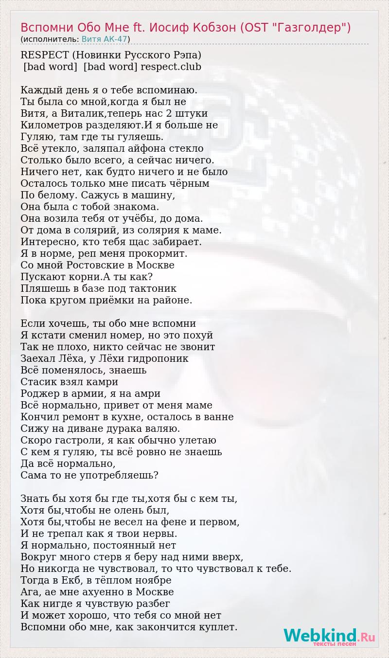 RESPECT (Новинки Русского Рэпа) [bad word] [bad word] respect.club Каждый день я о тебе вспоминаю. Ты была со мной,когда я был не Витя, а Виталик,теперь нас 2 штуки Километров разделяют.И я больше не Гуляю, там где ты гуляешь. Всё утекло, заляпал айфона стекло Столько было всего, а сейчас ничего. Ничего нет, как будто ничего и не было Осталось только мне писать чёрным По белому. Сажусь в машину, Она была с тобой знакома. Она возила тебя от учёбы, до дома. От дома в солярий, из солярия к маме. Интересно, кто тебя щас забирает. Я в норме, реп меня прокормит. Со мной Ростовские в Москве Пускают корни.А ты как? Пляшешь в базе под тактоник Пока кругом приёмки на районе. Если хочешь, ты обо мне вспомни Я кстати сменил номер, но это похуй Так не плохо, никто сейчас не звонит Заехал Лёха, у Лёхи гидропоник Всё поменялось, знаешь Стасик взял камри Роджер в армии, я на амри Всё нормально, привет от меня маме Кончил ремонт в кухне, осталось в ванне Сижу на диване дурака валяю. Скоро гастроли, я как обычно улетаю С кем я гуляю, ты всё ровно не знаешь Да всё нормально, Сама то не употребляешь? Знать бы хотя бы где ты,хотя бы с кем ты, Хотя бы,чтобы не олень был, Хотя бы,чтобы не весел на фене и первом, И не трепал как я твои нервы. Я нормально, постоянный нет Вокруг много стерв я беру над ними вверх, Но никогда не чувствовал, то что чувствовал к тебе. Тогда в Екб, в тёплом ноябре Ага, ае мне ахуенно в Москве Как нигде я чувствую разбег И может хорошо, что тебя со мной нет Вспомни обо мне, как закончится куплет.