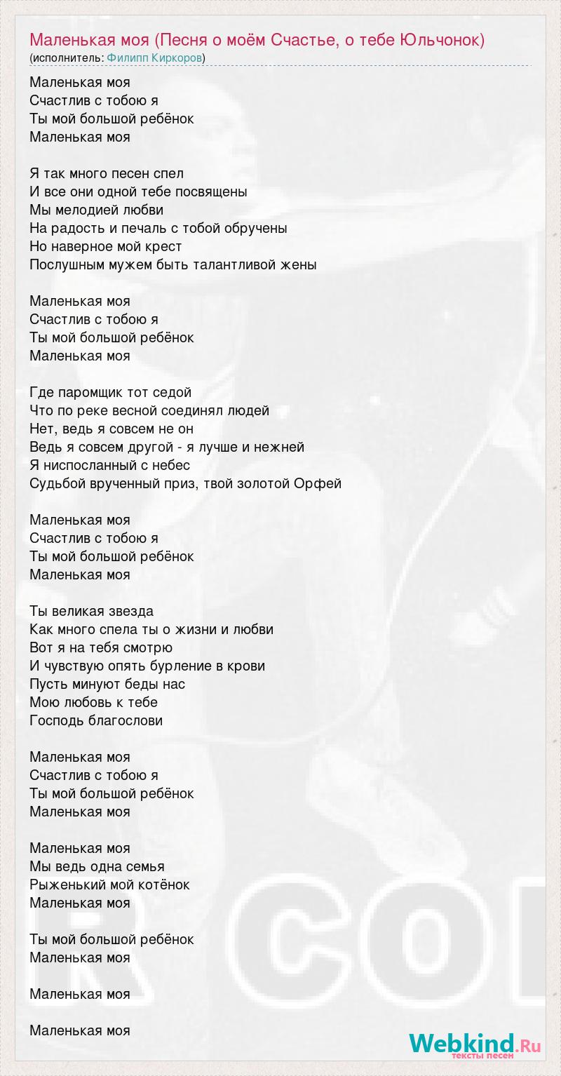 Маленькая моя Счастлив с тобою я Ты мой большой ребёнок Маленькая моя Я так много песен спел И все они одной тебе посвящены Мы мелодией любви На радость и печаль с тобой обручены Но наверное мой крест Послушным мужем быть талантливой жены Маленькая моя Счастлив с тобою я Ты мой большой ребёнок Маленькая моя Где паромщик тот седой Что по реке весной соединял людей Нет, ведь я совсем не он Ведь я совсем другой - я лучше и нежней Я ниспосланный с небес Судьбой врученный приз, твой золотой Орфей Маленькая моя Счастлив с тобою я Ты мой большой ребёнок Маленькая моя Ты великая звезда Как много спела ты о жизни и любви Вот я на тебя смотрю И чувствую опять бурление в крови Пусть минуют беды нас Мою любовь к тебе Господь благослови Маленькая моя Счастлив с тобою я Ты мой большой ребёнок Маленькая моя Маленькая моя Мы ведь одна семья Рыженький мой котёнок Маленькая моя Ты мой большой ребёнок Маленькая моя Маленькая моя Маленькая моя