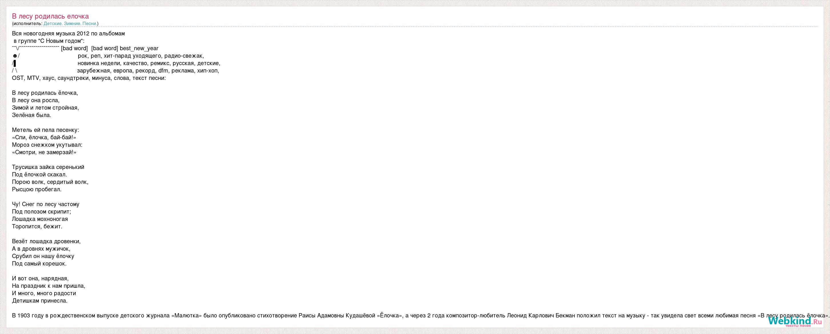 Вся новогодняя музыка 2012 по альбомам в группе "С Новым годом": ¯¯\/¯¯¯¯¯¯¯¯¯¯¯¯¯¯¯¯¯¯¯¯ [bad word] [bad word] best_new_year ☻/ рок, реп, хит-парад уходящего, радио-свежак, /▌ новинка недели, качество, ремикс, русская, детские, / \ зарубежная, европа, рекорд, dfm, реклама, хип-хоп, OST, MTV, хаус, саундтреки, минуса, слова, текст песни: В лесу родилась ёлочка, В лесу она росла, Зимой и летом стройная, Зелёная была. Метель ей пела песенку: «Спи, ёлочка, бай-бай!» Мороз снежком укутывал: «Смотри, не замерзай!» Трусишка зайка серенький Под ёлочкой скакал. Порою волк, сердитый волк, Рысцою пробегал. Чу! Снег по лесу частому Под полозом скрипит; Лошадка мохноногая Торопится, бежит. Везёт лошадка дровенки, А в дровнях мужичок, Срубил он нашу ёлочку Под самый корешок. И вот она, нарядная, На праздник к нам пришла, И много, много радости Детишкам принесла. В 1903 году в рождественском выпуске детского журнала «Малютка» было опубликовано стихотворение Раисы Адамовны Кудашёвой «Ёлочка», а через 2 года композитор-любитель Леонид Карлович Бекман положил текст на музыку - так увидела свет всеми любимая песня «В лесу родилась ёлочка».