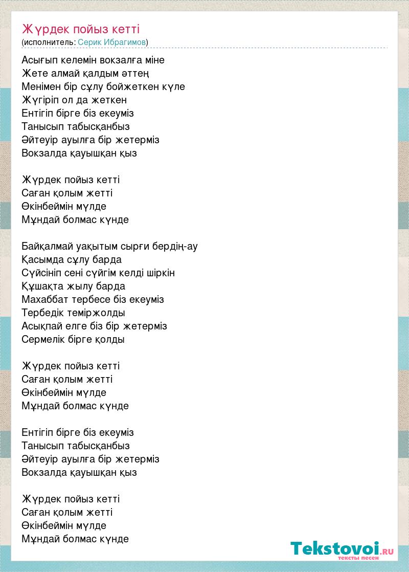 Асығып келемін вокзалға міне Жете алмай қалдым әттең Менімен бір сұлу бойжеткен күле Жүгіріп ол да жеткен Ентігіп бірге біз екеуміз Танысып табысқанбыз Әйтеуір ауылға бір жетерміз Вокзалда қауышқан қыз Жүрдек пойыз кетті Саған қолым жетті Өкінбеймін мүлде Мұндай болмас күнде Байқалмай уақытым сырғи бердің-ау Қасымда сұлу барда Сүйсініп сені сүйгім келді шіркін Құшақта жылу барда Махаббат тербесе біз екеуміз Тербедік теміржолды Асықпай елге біз бір жетерміз Сермелік бірге қолды Жүрдек пойыз кетті Саған қолым жетті Өкінбеймін мүлде Мұндай болмас күнде Ентігіп бірге біз екеуміз Танысып табысқанбыз Әйтеуір ауылға бір жетерміз Вокзалда қауышқан қыз Жүрдек пойыз кетті Саған қолым жетті Өкінбеймін мүлде Мұндай болмас күнде