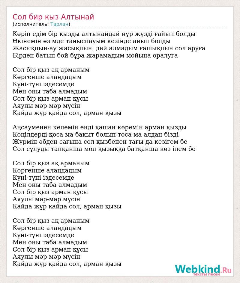 Көріп едім бір қызды алтынайдай нұр жүзді ғайып болды Өкінемін өзімде таныспауым кезінде айып болды Жасықпын-ау жасықпын, дей алмадым ғашықпын сол аруға Бірден батып бой бұра жарамадым мойына оралуға Сол бір қыз ақ арманым Көргенше алаңдадым Күні-түні іздесемде Мен оны таба алмадым Сол бір қыз арман құсы Аяулы мәр-мәр мүсін Қайда жүр қайда сол, арман қызы Аңсауменен келемін енді қашан көремін арман қызды Көңілдерді қоса ма бақыт болып тоса ма алдан бізді Жүрмін әбден сағына сол қызбенен тағы да кезігем бе Сол сұлуды тапқанша мол қызыққа батқанша көз ілем бе Сол бір қыз ақ арманым Көргенше алаңдадым Күні-түні іздесемде Мен оны таба алмадым Сол бір қыз арман құсы Аяулы мәр-мәр мүсін Қайда жүр қайда сол, арман қызы Сол бір қыз ақ арманым Көргенше алаңдадым Күні-түні іздесемде Мен оны таба алмадым Сол бір қыз арман құсы Аяулы мәр-мәр мүсін Қайда жүр қайда сол, арман қызы