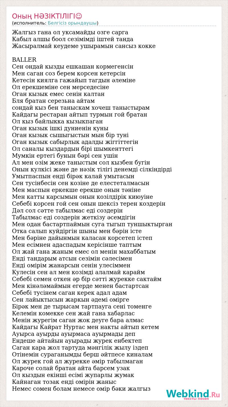 Жалгыз гана ол уксамайды озге сарга Кабыл алшы боол сезімімді іштей танда Жасыралмай кеудеме ушырамын сансыз кокке BALLER Сен ондай кызды ешкашан кормегенсін Мен саган соз берем корсен кетерсін Кетесін киялга гажайып тагдын әлеміне Ол ерекшеміне сен мерседесіне Оган кызык емес сенін калтан Бля братан серезьна айтам сондай кыз бен таныскам хочеш таныстырам Кайдагы рестаран айтып турмын гой братан Ол кыз байлыкка кызыкпаган Оган кызык ішкі дуниенін куны Оган кызык сышыгыстын мын бір туні Оган кызык сабырлык адалды жіггіттегін Ол саналы кыздардын бірі шымкенттегі Мумкін ертегі бунын бәрі сен ушін Ал мен озім жеке таныстым сол кызбен бугін Онын кулкісі және де нәзік тілігі денемді сілкіндірді Умытпаспын енді бірәк калай умытасын Сен тусінбесін сен козіне де елестеталмасын Мен маспын еркекше ерекше онын тәніне Мен катты карсымын онын козілдірік киюуіне Себебі корсен гой сен онын шексіз терен коздерін Дәл сол сәтте табылмас еді создерін Табылмас еді создерін жеткізу әсемдігін Мен одан бастартпаймын суга тыгып туншыктырган Отка салып куйдіргін шыны мен бәрін істе Мен бәріне дайынмын каласан корсетеп істеп Мен есімнен адаспадым керісінше таптым Ол жай гана жаным емес ол менін махаббатым Енді тандарым атсын сезімін сәлесімен Енді омірім жанарсын сенін улесіммен Кулесін сен ал мен козімді алалмай карайм Себебі семен откен әр бір сәтті журекке сактайм Мен кінәләмаймын егерде менен бастартсан Себебі тусінем саган керек адал адам Сен лайыктысын жаркын әдемі омірге Бірәк мен де тырысам тартпауга сені томенге Келемін комекке сен жай гана хабарлас Менін журегім саган жок деуге бара алмас Кайдагы Кайрат Нуртас мен накты айтып кетем Ауырса ауырды ауырмаса ауырмады деп Ендеше айтайын ауырады журек енбектеп Саган кара жол тартуда мәнгілік жылу іздеп Отінемін сураганымды берш әйтпесе киналам Ол журек гой ал журекке әмір табылмаган Кароче солай братан айта барсем узак Ол кыздын екінші есімі жупарлы жумак Кайнаган тозак енді омірін жаныс Немес сомен болам немесе омір бәки жалгыз