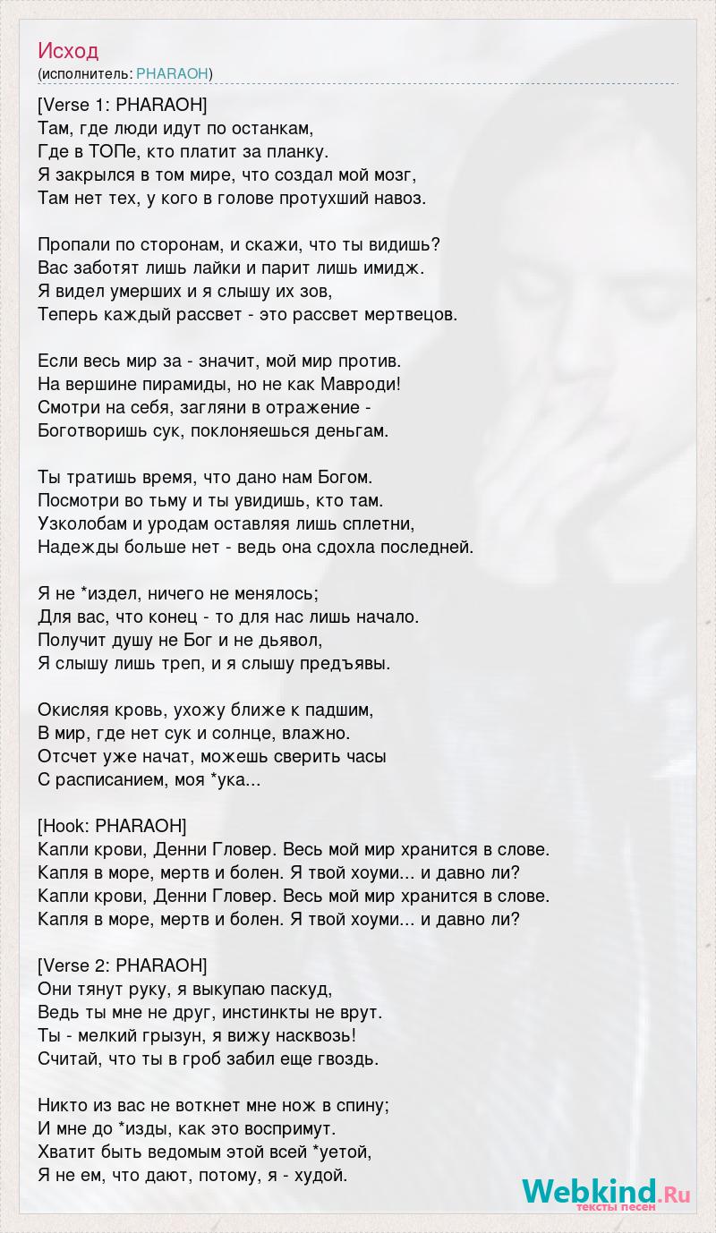 [Verse 1: PHARAOH] Там, где люди идут по останкам, Где в ТОПе, кто платит за планку. Я закрылся в том мире, что создал мой мозг, Там нет тех, у кого в голове протухший навоз. Пропали по сторонам, и скажи, что ты видишь? Вас заботят лишь лайки и парит лишь имидж. Я видел умерших и я слышу их зов, Теперь каждый рассвет - это рассвет мертвецов. Если весь мир за - значит, мой мир против. На вершине пирамиды, но не как Мавроди! Смотри на себя, загляни в отражение - Боготворишь сук, поклоняешься деньгам. Ты тратишь время, что дано нам Богом. Посмотри во тьму и ты увидишь, кто там. Узколобам и уродам оставляя лишь сплетни, Надежды больше нет - ведь она сдохла последней. Я не *издел, ничего не менялось; Для вас, что конец - то для нас лишь начало. Получит душу не Бог и не дьявол, Я слышу лишь треп, и я слышу предъявы. Окисляя кровь, ухожу ближе к падшим, В мир, где нет сук и солнце, влажно. Отсчет уже начат, можешь сверить часы С расписанием, моя *ука... [Hook: PHARAOH] Капли крови, Денни Гловер. Весь мой мир хранится в слове. Капля в море, мертв и болен. Я твой хоуми... и давно ли? Капли крови, Денни Гловер. Весь мой мир хранится в слове. Капля в море, мертв и болен. Я твой хоуми... и давно ли? [Verse 2: PHARAOH] Они тянут руку, я выкупаю паскуд, Ведь ты мне не друг, инстинкты не врут. Ты - мелкий грызун, я вижу насквозь! Считай, что ты в гроб забил еще гвоздь. Никто из вас не воткнет мне нож в спину; И мне до *изды, как это воспримут. Хватит быть ведомым этой всей *уетой, Я не ем, что дают, потому, я - худой.