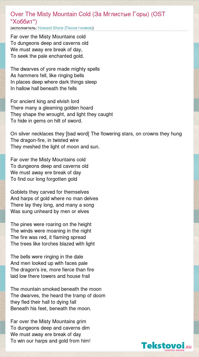 Far over the Misty Mountains cold To dungeons deep and caverns old We must away ere break of day, To seek the pale enchanted gold. The dwarves of yore made mighty spells As hammers fell, like ringing bells In places deep where dark things sleep In hallow hall beneath the fells For ancient king and elvish lord There many a gleaming golden hoard They shape the wrought, and light they caught To hide in gems on hilt of sword. On silver necklaces they [bad word] The flowering stars, on crowns they hung The dragon-fire, in twisted wire They meshed the light of moon and sun. Far over the Misty Mountains cold To dungeons deep and caverns old We must away ere break of day To find our long forgotten gold Goblets they carved for themselves And harps of gold where no man delves There lay they long, and many a song Was sung unheard by men or elves The pines were roaring on the height The winds were moaning in the night The fire was red, it flaming spread The trees like torches blazed with light The bells were ringing in the dale And men looked up with faces pale The dragon's ire, more fierce than fire laid low there towers and house frail The mountain smoked beneath the moon The dwarves, the heard the tramp of doom they fled their hall to dying fall Beneath his feet, beneath the moon. Far over the Misty Mountains grim To dungeons deep and caverns dim We must away ere break of day To win our harps and gold from him!