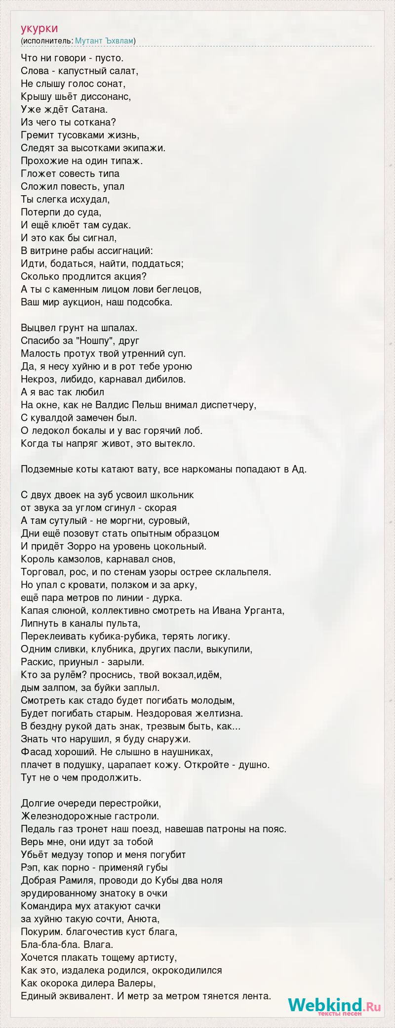 Что ни говори - пусто. Cлова - капустный салат, Не слышу голос сонат, Крышу шьёт диссонанс, Уже ждёт Сатана. Из чего ты соткана? Гремит тусовками жизнь, Следят за высотками экипажи. Прохожие на один типаж. Гложет совесть типа Сложил повесть, упал Ты слегка исхудал, Потерпи до суда, И ещё клюёт там судак. И это как бы сигнал, В витрине рабы ассигнаций: Идти, бодаться, найти, поддаться; Сколько продлится акция? А ты с каменным лицом лови беглецов, Ваш мир аукцион, наш подсобка. Выцвел грунт на шпалах. Спасибо за "Ношпу", друг Малость протух твой утренний суп. Да, я несу хуйню и в рот тебе уроню Некроз, либидо, карнавал дибилов. А я вас так любил На окне, как не Валдис Пельш внимал диспетчеру, С кувалдой замечен был. О ледокол бокалы и у вас горячий лоб. Когда ты напряг живот, это вытекло. Подземные коты катают вату, все наркоманы попадают в Ад. С двух двоек на зуб усвоил школьник от звука за углом сгинул - скорая А там сутулый - не моргни, суровый, Дни ещё позовут стать опытным образцом И придёт Зорро на уровень цокольный. Король камзолов, карнавал снов, Торговал, рос, и по стенам узоры острее склальпеля. Но упал с кровати, ползком и за арку, ещё пара метров по линии - дурка. Капая слюной, коллективно смотреть на Ивана Урганта, Липнуть в каналы пульта, Переклеивать кубика-рубика, терять логику. Одним сливки, клубника, других пасли, выкупили, Раскис, приуныл - зарыли. Кто за рулём? проснись, твой вокзал,идём, дым залпом, за буйки заплыл. Смотреть как стадо будет погибать молодым, Будет погибать старым. Нездоровая желтизна. В бездну рукой дать знак, трезвым быть, как... Знать что нарушил, я буду снаружи. Фасад хороший. Не слышно в наушниках, плачет в подушку, царапает кожу. Откройте - душно. Тут не о чем продолжить. Долгие очереди перестройки, Железнодорожные гастроли. Педаль газ тронет наш поезд, навешав патроны на пояс. Верь мне, они идут за тобой Убьёт медузу топор и меня погубит Рэп, как порно - применяй губы Добрая Рамиля, проводи до Кубы два ноля эрудированному знатоку в очки Командира мух атакуют сачки за хуйню такую сочти, Анюта, Покурим. благочестив куст блага, Бла-бла-бла. Влага. Хочется плакать тощему артисту, Как это, издалека родился, окрокодилился Как окорока дилера Валеры, Единый эквивалент. И метр за метром тянется лента.