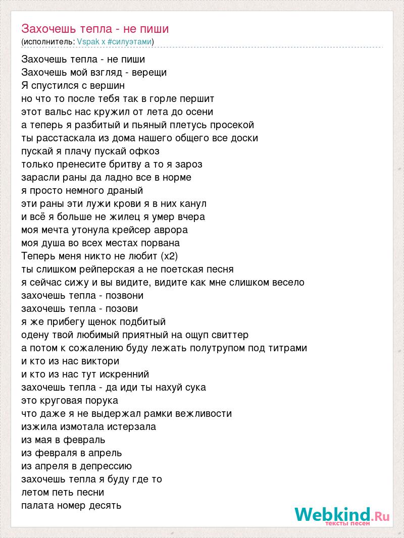 Захочешь тепла - не пиши Захочешь мой взгляд - верещи Я спустился с вершин но что то после тебя так в горле першит этот вальс нас кружил от лета до осени а теперь я разбитый и пьяный плетусь просекой ты расстаскала из дома нашего общего все доски пускай я плачу пускай офкоз только пренесите бритву а то я зароз зарасли раны да ладно все в норме я просто немного драный эти раны эти лужи крови я в них канул и всё я больше не жилец я умер вчера моя мечта утонула крейсер аврора моя душа во всех местах порвана Теперь меня никто не любит (x2) ты слишком рейперская а не поетская песня я сейчас сижу и вы видите, видите как мне слишком весело захочешь тепла - позвони захочешь тепла - позови я же прибегу щенок подбитый одену твой любимый приятный на ощуп свиттер а потом к сожалению буду лежать полутрупом под титрами и кто из нас виктори и кто из нас тут искренний захочешь тепла - да иди ты нахуй сука это круговая порука что даже я не выдержал рамки вежливости изжила измотала истерзала из мая в февраль из февраля в апрель из апреля в депрессию захочешь тепла я буду где то летом петь песни палата номер десять
