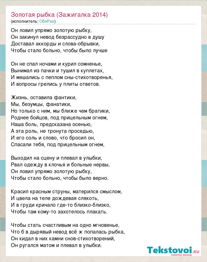 Он ловил упрямо золотую рыбку, Он закинул невод безрассудно в душу Доставал аккорды и слова-обрывки, Чтобы стало больно, чтобы было лучше Он не спал ночами и курил сомненье, Вынимал из пачки и тушил в куплетах, И мешались с пеплом сны-стихотворенья, И вопросы грелись у плиты ответов. Жизнь, оставила фантики, Мы, безумцы, фанатики, Но только с ним, мы ближе чем братики, Роднее бойцов, под прицельным огнем, Наша боль, предсказана осенью, А эта роль, не тронута проседью, И его соль и слово, что бросил он, Спасали тебя, под прицельным огнем, Выходил на сцену и плевал в улыбки, Рвал одежду в клочья и больные нервы, Он ловил упрямо золотую рыбку, Чтобы стало больно, чтобы было верно. Красил красным струны, матерился смыслом, И цвела на теле дождевая слякоть, И в груди кричало где-то близко-близко, Чтобы там кому-то захотелось плакать. Чтобы стать счастливым на одно мгновенье, Что б в дырявый невод всё ж попалась рыбка, Он кидал в них камни снов-стихотворений, Он ругался матом и плевал в улыбки.