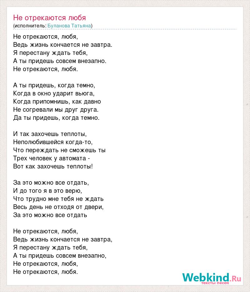 Не отрекаются, любя, Ведь жизнь кончается не завтра. Я перестану ждать тебя, А ты придешь совсем внезапно. Не отрекаются, любя. А ты придешь, когда темно, Когда в окно ударит вьюга, Когда припомнишь, как давно Не согревали мы друг друга. Да ты придешь, когда темно. И так захочешь теплоты, Неполюбившейся когда-то, Что переждать не сможешь ты Трех человек у автомата - Вот как захочешь теплоты! За это можно все отдать, И до того я в это верю, Что трудно мне тебя не ждать Весь день не отходя от двери, За это можно все отдать Не отрекаются, любя, Ведь жизнь кончается не завтра, Я перестану ждать тебя, А ты придешь совсем внезапно, Не отрекаются, любя, Не отрекаются, любя.