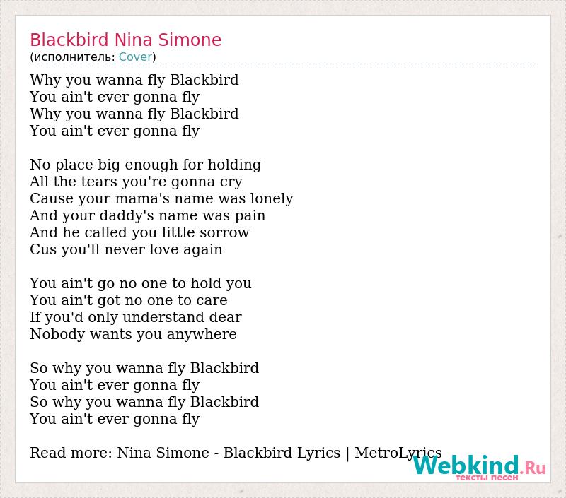 Why you wanna fly Blackbird You ain't ever gonna fly Why you wanna fly Blackbird You ain't ever gonna fly No place big enough for holding All the tears you're gonna cry Cause your mama's name was lonely And your daddy's name was pain And he called you little sorrow Cus you'll never love again You ain't go no one to hold you You ain't got no one to care If you'd only understand dear Nobody wants you anywhere So why you wanna fly Blackbird You ain't ever gonna fly So why you wanna fly Blackbird You ain't ever gonna fly Read more: Nina Simone - Blackbird Lyrics | MetroLyrics