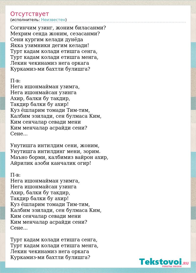 Согинчим узинг, жоним биласанми? Мехрим сенда жоним, сезасанми? Сени кургим келади дунёда Якка узимники дегим келади! Турт кадам колади етишга сенга, Турт кадам колади етишга менга, Лекин чекинамиз нега оркага Куркамиз-ми бахтли булишга? П-в: Нега ишонмайман узимга, Нега ишонмайсан узинга Ахир, балки бу такдир, Такдир балки бу ахир! Куз ёшларим томади Тим-тим, Калбим эзилади, сен булмаса Ким, Ким сенчалар севади мени Ким менчалар асрайди сени? Сене... Унутишга интилдим сени, жоним, Унутишга интилдинг мени, зорим. Маъно борми, калбимиз вайрон ахир, Айрилик азоби канчалик огир! П-в: Нега ишонмайман узимга, Нега ишонмайсан узинга Ахир, балки бу такдир, Такдир балки бу ахир! Куз ёшларим томади Тим-тим, Калбим эзилади, сен булмаса Ким, Ким сенчалар севади мени Ким менчалар асрайди сени? Сене... Турт кадам колади етишга сенга, Турт кадам колади етишга менга, Лекин чекинамиз нега оркага Куркамиз-ми бахтли булишга?