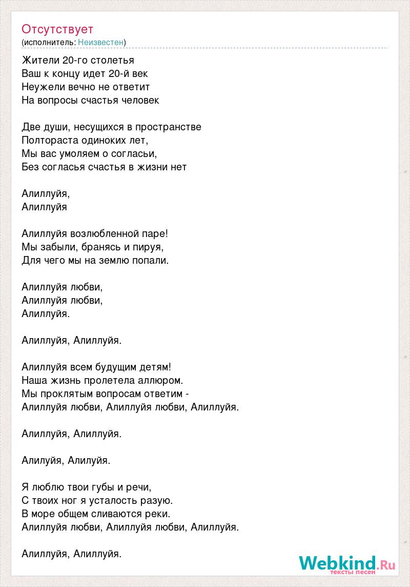 Жители 20-го столетья Ваш к концу идет 20-й век Неужели вечно не ответит На вопросы счастья человек Две души, несущихся в пространстве Полтораста одиноких лет, Мы вас умоляем о согласьи, Без согласья счастья в жизни нет Алиллуйя, Алиллуйя Алиллуйя возлюбленной паре! Мы забыли, бранясь и пируя, Для чего мы на землю попали. Алиллуйя любви, Алиллуйя любви, Алиллуйя. Алиллуйя, Алиллуйя. Алиллуйя всем будущим детям! Наша жизнь пролетела аллюром. Мы проклятым вопросам ответим - Алиллуйя любви, Алиллуйя любви, Алиллуйя. Алиллуйя, Алиллуйя. Алилуйя, Алилуйя. Я люблю твои губы и речи, С твоих ног я усталость разую. В море общем сливаются реки. Алиллуйя любви, Алиллуйя любви, Алиллуйя. Алиллуйя, Алиллуйя.