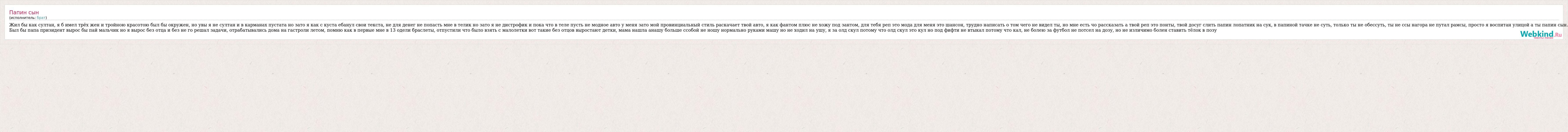 Жил бы как султан, я б имел трёх жен и тройною красотою был бы окружен, но увы я не султан и в карманах пустата но зато я как с куста ебанул свои текста, не для денег не попасть мне в телик но зато я не дистрофик и пока что в теле пусть не модное авто у меня зато мой провинциальный стиль раскачает твой авто, я как фантом плюс не хожу под зантом, для тебя реп это мода для меня это шансон, трудно написать о том чего не видел ты, но мне есть чо рассказать а твой реп это понты, твой досуг слить папин лопатник на сук, в папиной тачке не суть, только ты не обессуть, ты не ссы нагора не путал рамсы, просто я воспитан улицой а ты папин сын. Был бы папа призидент вырос бы пай мальчик но я вырос без отца и без не го решал задачи, отрабатывались дома на гастроли летом, помню как в первые мне в 13 одели браслеты, отпустили что было взять с малолетки вот такие без отцов выростают детки, мама нашла анашу больше ссобой не ношу нормально руками машу но не ходил на ушу, я за олд скул потому что олд скул это кул но под фифти не втыкал потому что кал, не болею за футбол не потсел на дозу, но не изличимо болен ставить тёлок в позу