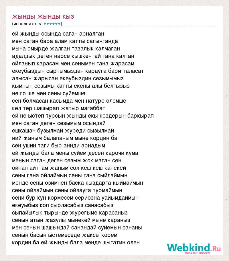 ей жынды осында саган арналган мен саган бара алам катты сагынганда мына омырде жалган тазалык калмаган адалдык деген нарсе кышкентай гана калган ойланып карасам мен сенымен гана жарасам екеубыздын сыртымыздан карауга бари таласат алысан жарысан екеубыздин сезымымыз кымнын сезымы катты екены алы белгызыз не го ше мен сены суйемше сен болмасан касымда мен натуре олемше кел тер шашырап жатыр магаббат ей не ыстеп турсын жынды екы коздерын баркырап мен саган деген сезымым осындай ешкашан бузылмай журеди сызылмай иий жаным балапаным мыне кордин ба сен ушин таги быр аннди арнадым ей жынды бала мены суйем десен карочи кума менын саган деген сезым жок маган сен ойнап айттам жаным сол кеш кеш канекей сены гана ойлаймын сены гана сыйлаймын менде сены озимнен баска кыздарга кыймаймын сены ойлаймын сены ойлауга турмаймын сени бур кун кормесем сериозна уайымдаймын екеуыбыз коп сырласабыз санасабыз сыпайылык тырынде журегыме карасаныз сенын атын жазулы мынекей мыне караныз мен сенын шашындай санандай суйемын сананы сенын басын ыстемеседе жаксы корем кордин ба ей жынды бала менде шыгатин олен