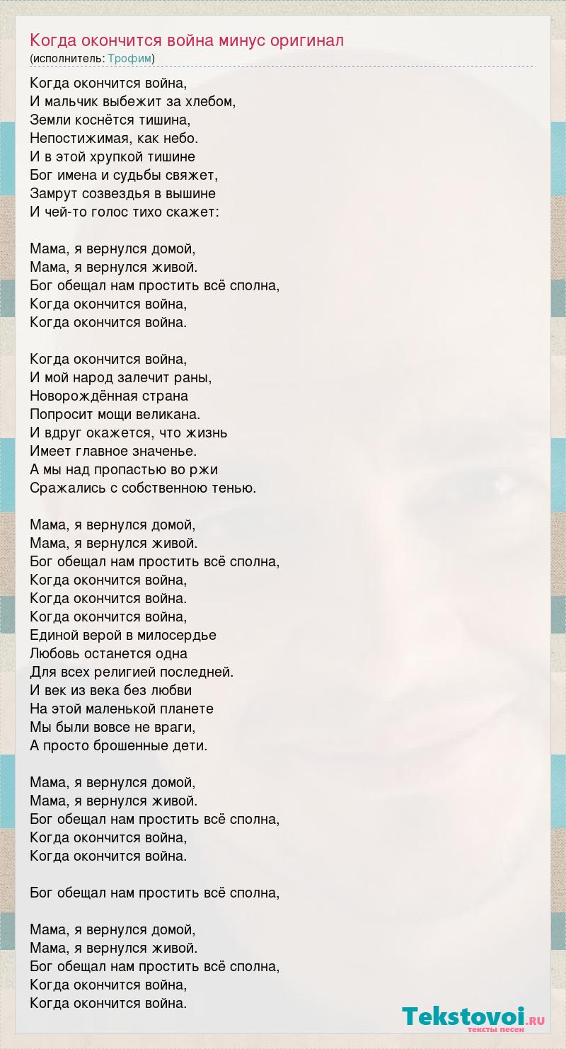 Когда окончится война, И мальчик выбежит за хлебом, Земли коснётся тишина, Непостижимая, как небо. И в этой хрупкой тишине Бог имена и судьбы свяжет, Замрут созвездья в вышине И чей-то голос тихо скажет: Мама, я вернулся домой, Мама, я вернулся живой. Бог обещал нам простить всё сполна, Когда окончится война, Когда окончится война. Когда окончится война, И мой народ залечит раны, Новорождённая страна Попросит мощи великана. И вдруг окажется, что жизнь Имеет главное значенье. А мы над пропастью во ржи Сражались с собственною тенью. Мама, я вернулся домой, Мама, я вернулся живой. Бог обещал нам простить всё сполна, Когда окончится война, Когда окончится война. Когда окончится война, Единой верой в милосердье Любовь останется одна Для всех религией последней. И век из века без любви На этой маленькой планете Мы были вовсе не враги, А просто брошенные дети. Мама, я вернулся домой, Мама, я вернулся живой. Бог обещал нам простить всё сполна, Когда окончится война, Когда окончится война. Бог обещал нам простить всё сполна, Мама, я вернулся домой, Мама, я вернулся живой. Бог обещал нам простить всё сполна, Когда окончится война, Когда окончится война.