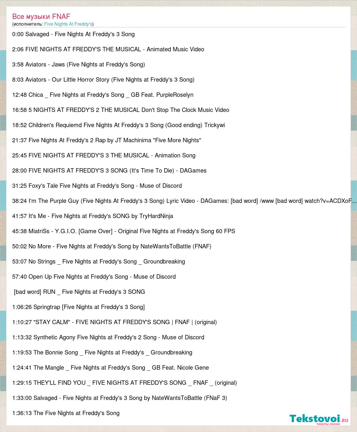 0:00 Salvaged - Five Nights At Freddy's 3 Song 2:06 FIVE NIGHTS AT FREDDY'S THE MUSICAL - Animated Music Video 3:58 Aviators - Jaws (Five Nights at Freddy's Song) 8:03 Aviators - Our Little Horror Story (Five Nights at Freddy's 3 Song) 12:48 Chica _ Five Nights at Freddy's Song _ GB Feat. PurpleRoselyn 16:58 5 NIGHTS AT FREDDY'S 2 THE MUSICAL Don't Stop The Clock Music Video 18:52 Children's Requiemd Five Nights At Freddy's 3 Song (Good ending) Trickywi 21:37 Five Nights At Freddy's 2 Rap by JT Machinima "Five More Nights" 25:45 FIVE NIGHTS AT FREDDY'S 3 THE MUSICAL - Animation Song 28:00 FIVE NIGHTS AT FREDDY'S 3 SONG (It's Time To Die) - DAGames 31:25 Foxy's Tale Five Nights at Freddy's Song - Muse of Discord 38:24 I'm The Purple Guy (Five Nights At Freddy's 3 Song) Lyric Video - DAGames: [bad word] /www [bad word] watch?v=ACDXoF... 41:57 It's Me - Five Nights at Freddy's SONG by TryHardNinja 45:38 MiatriSs - Y.G.I.O. [Game Over] - Original Five Nights at Freddy's Song 60 FPS 50:02 No More - Five Nights at Freddy's Song by NateWantsToBattle (FNAF) 53:07 No Strings _ Five Nights at Freddy's Song _ Groundbreaking 57:40 Open Up Five Nights at Freddy's Song - Muse of Discord 1:03:01 RUN RUN _ Five Nights at Freddy's 3 SONG 1:06:26 Springtrap [Five Nights at Freddy's 3 Song] 1:10:27 "STAY CALM" - FIVE NIGHTS AT FREDDY'S SONG | FNAF | (original) 1:13:32 Synthetic Agony Five Nights at Freddy's 2 Song - Muse of Discord 1:19:53 The Bonnie Song _ Five Nights at Freddy's _ Groundbreaking 1:24:41 The Mangle _ Five Nights at Freddy's Song _ GB Feat. Nicole Gene 1:29:15 THEY'LL FIND YOU _ FIVE NIGHTS AT FREDDY'S SONG _ FNAF _ (original) 1:33:00 Salvaged - Five Nights at Freddy's 3 Song by NateWantsToBattle (FNaF 3) 1:36:13 The Five Nights at Freddy's Song