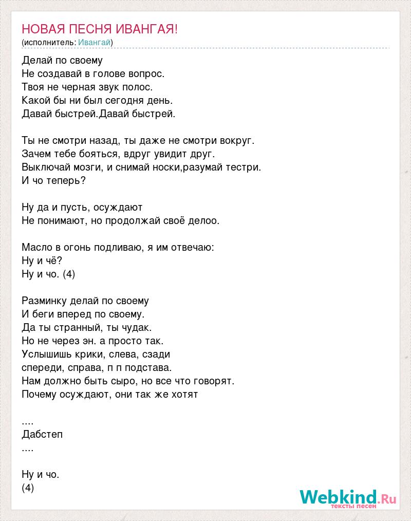Делай по своему Не создавай в голове вопрос. Твоя не черная звук полос. Какой бы ни был сегодня день. Давай быстрей.Давай быстрей. Ты не смотри назад, ты даже не смотри вокруг. Зачем тебе бояться, вдруг увидит друг. Выключай мозги, и снимай носки,разумай тестри. И чо теперь? Ну да и пусть, осуждают Не понимают, но продолжай своё делоо. Масло в огонь подливаю, я им отвечаю: Ну и чё? Ну и чо. (4) Разминку делай по своему И беги вперед по своему. Да ты странный, ты чудак. Но не через эн. а просто так. Услышишь крики, слева, сзади спереди, справа, п п подстава. Нам должно быть сыро, но все что говорят. Почему осуждают, они так же хотят .... Дабстеп .... Ну и чо. (4)