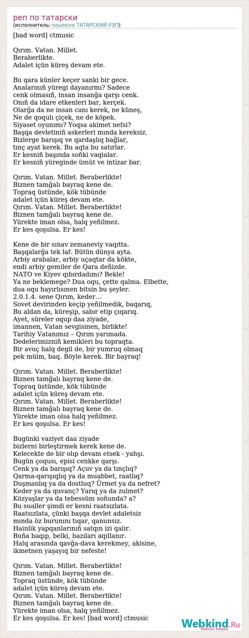 [bad word] ctmusic Qırım. Vatan. Millet. Beraberlikte. Adalet içün küreş devam ete. Bu qara künler keçer sanki bir gece. Analarınıñ yüregi dayanırmı? Sadece cenk olmasıñ, insan insanğa qarşı cenk. Onıñ da idare etkenleri bar, kerçek. Olarğa da ne insan canı kerek, ne küneş, Ne de qoqulı çiçek, ne de köpek. Siyaset oyunımı? Yoqsa akimet nefsi? Başqa devletiniñ askerleri mında kereksiz. Bizlerge barışıq ve qardaşlıq bağlar, tınç ayat kerek. Bu aqta bu satırlar. Er kesniñ başında soñki vaqialar. Er kesniñ yüreginde ümüt ve intizar bar. Qırım. Vatan. Millet. Beraberlikte! Biznen tamğalı bayraq kene de. Topraq üstünde, kök tübünde adalet içün küreş devam ete. Qırım. Vatan. Millet. Beraberlikte! Biznen tamğalı bayraq kene de. Yürekte iman olsa, halq yeñilmez. Er kes qoşulsa. Er kes! Kene de bir sınav zemaneviy vaqıtta. Başqalarğa tek laf. Bütün dünya ayta. Arbiy arabalar, arbiy uçaqtar da kökte, endi arbiy gemiler de Qara deñizde. NATO ve Kiyev qıbırdadımı? Bekle! Ya ne beklemege? Dua oqu, çette qalma. Elbette, dua oqu hayırlısınen bitsin bu şeyler. 2.0.1.4. sene Qırım, keder… Sovet devirinden keçip yeñilmedik, baqarıq, Bu aldan da, küreşip, sabır etip çıqarıq. Ayet, süreler oqup daa ziyade, imannen, Vatan sevgisinen, birlikte! Tarihiy Vatanımız – Qırım yarımada. Dedelerimizniñ kemikleri bu topraqta. Bir avuç halq degil de, bir yumruq olmaq pek müim, baq. Böyle kerek. Bir bayraq! Qırım. Vatan. Millet. Beraberlikte! Biznen tamğalı bayraq kene de. Topraq üstünde, kök tübünde adalet içün küreş devam ete. Qırım. Vatan. Millet. Beraberlikte! Biznen tamğalı bayraq kene de. Yürekte iman olsa halq yeñilmez. Er kes qoşulsa. Er kes! Bugünki vaziyet daa ziyade bizlerni birleştirmek kerek kene de. Kelecekte de bir olıp devam etsek - yahşı. Bugün çoqusı, episi cenkke qarşı. Cenk ya da barışıq? Açuv ya da tınçlıq? Qarma-qarışıqlıq ya da muabbet, raatlıq? Duşmanlıq ya da dostluq? Ürmet ya da nefret? Keder ya da quvanç? Yarıq ya da zulmet? Közyaşlar ya da tebessüm soñunda? a? Bu sualler şimdi er kesni raatsızlata. Raatsızlata, çünki başqa devlet adaletsiz mında öz burunını tıqar, qanunsız. Hainlik yapqanlarınıñ satqın izi qalır. Buña baqıp, belki, bazıları aqıllanır. Halq arasında qavğa-dava kerekmey, akisine, ikmetnen yaşayıq bir nefeste! Qırım. Vatan. Millet. Beraberlikte! Biznen tamğalı bayraq kene de. Topraq üstünde, kök tübünde adalet içün küreş devam ete. Qırım. Vatan. Millet. Beraberlikte! Biznen tamğalı bayraq kene de. Yürekte iman olsa, halq yeñilmez. Er kes qoşulsa. Er kes! [bad word] ctmusic