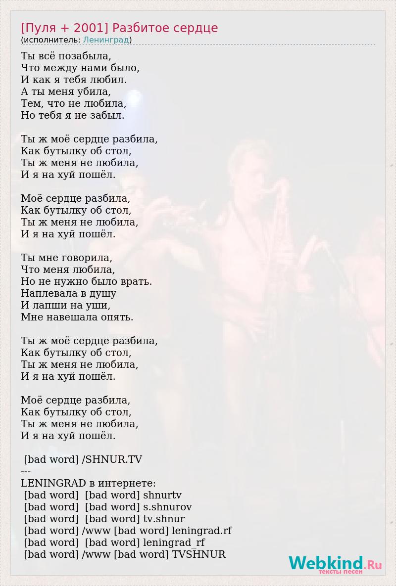Ты всё позабыла, Что между нами было, И как я тебя любил. А ты меня убила, Тем, что не любила, Но тебя я не забыл. Ты ж моё сердце разбила, Как бутылку об стол, Ты ж меня не любила, И я на хуй пошёл. Моё сердце разбила, Как бутылку об стол, Ты ж меня не любила, И я на хуй пошёл. Ты мне говорила, Что меня любила, Но не нужно было врать. Наплевала в душу И лапши на уши, Мне навешала опять. Ты ж моё сердце разбила, Как бутылку об стол, Ты ж меня не любила, И я на хуй пошёл. Моё сердце разбила, Как бутылку об стол, Ты ж меня не любила, И я на хуй пошёл. [bad word] /SHNUR.TV --- LENINGRAD в интернете: [bad word] [bad word] shnurtv [bad word] [bad word] s.shnurov [bad word] [bad word] tv.shnur [bad word] /www [bad word] leningrad.rf [bad word] [bad word] leningrad_rf [bad word] /www [bad word] TVSHNUR