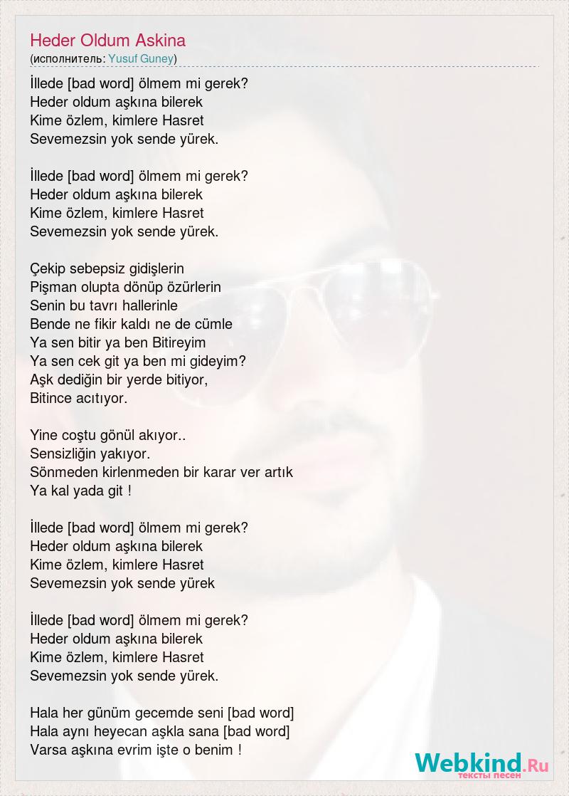 İllede [bad word] ölmem mi gerek? Heder oldum aşkına bilerek Kime özlem, kimlere Hasret Sevemezsin yok sende yürek. İllede [bad word] ölmem mi gerek? Heder oldum aşkına bilerek Kime özlem, kimlere Hasret Sevemezsin yok sende yürek. Çekip sebepsiz gidişlerin Pişman olupta dönüp özürlerin Senin bu tavrı hallerinle Bende ne fikir kaldı ne de cümle Ya sen bitir ya ben Bitireyim Ya sen cek git ya ben mi gideyim? Aşk dediğin bir yerde bitiyor, Bitince acıtıyor. Yine coştu gönül akıyor.. Sensizliğin yakıyor. Sönmeden kirlenmeden bir karar ver artık Ya kal yada git ! İllede [bad word] ölmem mi gerek? Heder oldum aşkına bilerek Kime özlem, kimlere Hasret Sevemezsin yok sende yürek İllede [bad word] ölmem mi gerek? Heder oldum aşkına bilerek Kime özlem, kimlere Hasret Sevemezsin yok sende yürek. Hala her günüm gecemde seni [bad word] Hala aynı heyecan aşkla sana [bad word] Varsa aşkına evrim işte o benim !