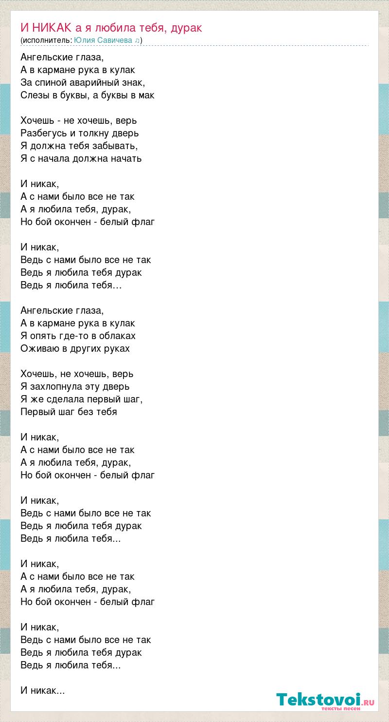 Ангельские глаза, А в кармане рука в кулак За спиной аварийный знак, Слезы в буквы, а буквы в мак Хочешь - не хочешь, верь Разбегусь и толкну дверь Я должна тебя забывать, Я с начала должна начать И никак, А с нами было все не так А я любила тебя, дурак, Но бой окончен - белый флаг И никак, Ведь с нами было все не так Ведь я любила тебя дурак Ведь я любила тебя… Ангельские глаза, А в кармане рука в кулак Я опять где-то в облаках Оживаю в других руках Хочешь, не хочешь, верь Я захлопнула эту дверь Я же сделала первый шаг, Первый шаг без тебя И никак, А с нами было все не так А я любила тебя, дурак, Но бой окончен - белый флаг И никак, Ведь с нами было все не так Ведь я любила тебя дурак Ведь я любила тебя... И никак, А с нами было все не так А я любила тебя, дурак, Но бой окончен - белый флаг И никак, Ведь с нами было все не так Ведь я любила тебя дурак Ведь я любила тебя... И никак...