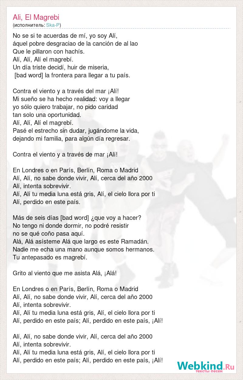 No se si te acuerdas de mí, yo soy Alí, áquel pobre desgraciao de la canción de al lao Que le pillaron con hachís. Alí, Alí, Alí el magrebí. Un día triste decidí, huir de miseria, [bad word] la frontera para llegar a tu país. Contra el viento y a través del mar ¡Alí! Mi sueño se ha hecho realidad: voy a llegar yo sólo quiero trabajar, no pido caridad tan solo una oportunidad. Alí, Alí, Alí el magrebí. Pasé el estrecho sin dudar, jugándome la vida, dejando mi familia, para algún día regresar. Contra el viento y a través de mar ¡Alí! En Londres o en París, Berlín, Roma o Madrid Alí, Alí, no sabe donde vivir, Alí, cerca del año 2000 Alí, intenta sobrevivir. Alí, Alí tu media luna está gris, Alí, el cielo llora por ti Alí, perdido en este país. Más de seis días [bad word] ¿que voy a hacer? No tengo ni donde dormir, no podré resistir no se qué coño pasa aquí. Alá, Alá asísteme Alá que largo es este Ramadán. Nadie me echa una mano aunque somos hermanos. Tu antepasado es magrebí. Grito al viento que me asista Alá, ¡Alá! En Londres o en París, Berlín, Roma o Madrid Alí, Alí, no sabe donde vivir, Alí, cerca del año 2000 Alí, intenta sobrevivir. Alí, Alí tu media luna está gris, Alí, el cielo llora por ti Alí, perdido en este país; Alí, perdido en este país, ¡Alí! Alí, Alí, no sabe donde vivir, Alí, cerca del año 2000 Alí, intenta sobrevivir. Alí, Alí tu media luna está gris, Alí, el cielo llora por ti Alí, perdido en este país; Alí, perdido en este país, ¡Alí!