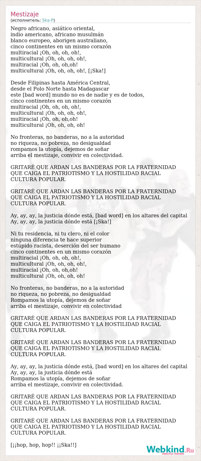 Negro africano, asiático oriental, indio americano, africano musulmán blanco europeo, aborigen australiano, cinco continentes en un mismo corazón multiracial ¡Oh, oh, oh, oh!, multicultural ¡Oh, oh, oh, oh!, multiracial ¡Oh, oh, oh,oh! multicultural ¡Oh, oh, oh, oh!, [¡Ska!] Desde Filipinas hasta América Central, desde el Polo Norte hasta Madagascar este [bad word] mundo no es de nadie y es de todos, cinco continentes en un mismo corazón multiracial ¡Oh, oh, oh, oh!, multicultural ¡Oh, oh, oh, oh!, multiracial ¡Oh, oh, oh,oh! multicultural ¡Oh, oh, oh, oh! No fronteras, no banderas, no a la autoridad no riqueza, no pobreza, no desigualdad rompamos la utopía, dejemos de soñar arriba el mestizaje, convivir en colectividad. GRITARÉ QUE ARDAN LAS BANDERAS POR LA FRATERNIDAD QUE CAIGA EL PATRIOTISMO Y LA HOSTILIDAD RACIAL CULTURA POPULAR. GRITARÉ QUE ARDAN LAS BANDERAS POR LA FRATERNIDAD QUE CAIGA EL PATRIOTISMO Y LA HOSTILIDAD RACIAL CULTURA POPULAR. Ay, ay, ay, la justicia dónde está, [bad word] en los altares del capital Ay, ay, ay, la justicia dónde está [¡Ska!] Ni tu residencia, ni tu clero, ni el color ninguna diferencia te hace superior estúpido racista, deserción del ser humano cinco continentes en un mismo corazón multiracial ¡Oh, oh, oh, oh!, multicultural ¡Oh, oh, oh, oh!, multiracial ¡Oh, oh, oh,oh! multicultural ¡Oh, oh, oh, oh! No fronteras, no banderas, no a la autoridad no riqueza, no pobreza, no desigualdad Rompamos la utopía, dejemos de soñar arriba el mestizaje, convivir en colectividad GRITARÉ QUE ARDAN LAS BANDERAS POR LA FRATERNIDAD QUE CAIGA EL PATRIOTISMO Y LA HOSTILIDAD RACIAL CULTURA POPULAR. GRITARÉ QUE ARDAN LAS BANDERAS POR LA FRATERNIDAD QUE CAIGA EL PATRIOTISMO Y LA HOSTILIDAD RACIAL CULTURA POPULAR. Ay, ay, ay, la justicia dónde está, [bad word] en los altares del capital Ay, ay, ay, la justicia dónde está Rompamos la utopía, dejemos de soñar arriba el mestizaje, convivir en colectividad. GRITARÉ QUE ARDAN LAS BANDERAS POR LA FRATERNIDAD QUE CAIGA EL PATRIOTISMO Y LA HOSTILIDAD RACIAL CULTURA POPULAR. GRITARÉ QUE ARDAN LAS BANDERAS POR LA FRATERNIDAD QUE CAIGA EL PATRIOTISMO Y LA HOSTILIDAD RACIAL CULTURA POPULAR. [¡¡hop, hop, hop!! ¡¡Ska!!]